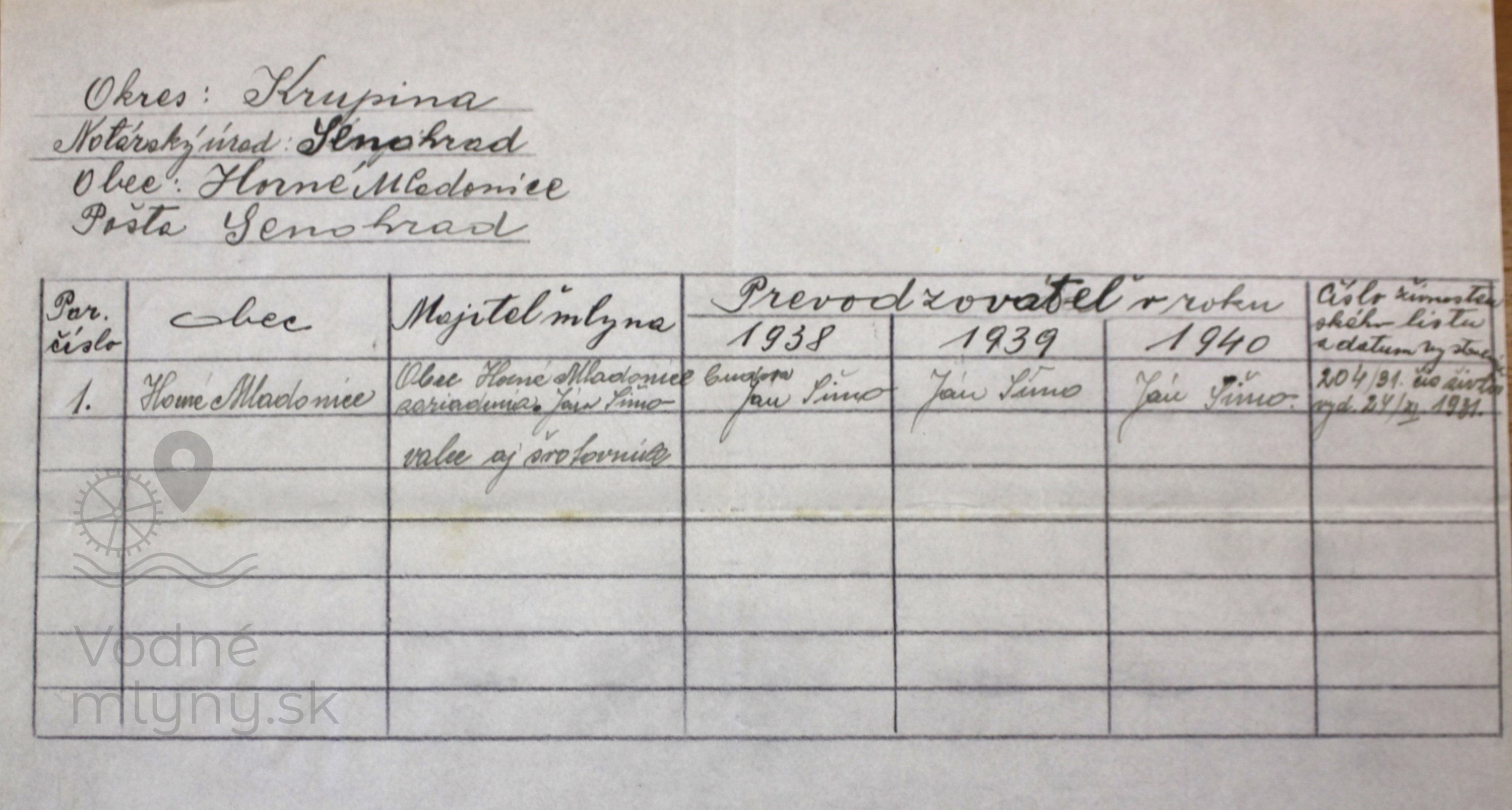 V súpise vodných diel (mlynov) Republiky československej od Finančného riaditeľstva Banská Bystrica z roku 1930 je uvedený vodný mlyn na adrese Horné Mladunice - popisné číslo 50. Stojí pri potoku Vrbovok s jedným horným kolesom (výkon 5,6 konských síl). Mlynicu prevádzkuje Jozef Beňovský (Josef Bénovský). Mlynárska rodina bývala v obytnom dome p. č. 49. Išlo o sedemčlennú rodinu pochádzajúcu z Uherského Brodu na Morave a do Horných Mladoníc sa presťahovali z Nemiec v Honte 15. augusta 1928. Mlynársky majster Jozef Beňovský sa narodil 10. februára 1892 v obci Hřivínův Újezd (Hřivný Újezd) na Morave a s manželkou Štefániou (narodená 24. marca 1895 v Uherskom Brode na Morave) sa zosobášili 1. augusta 1914. Narodilo sa im šesť detí, z ktorých jedno umrelo. Štyri deti sa im narodili v Argentíne (Monto a Comodoro Rivadavida) a najmladšia dcéra Vlasta sa narodila 2. júna 1926 v Uherskom Brode. Synovia Karel (narodený 25. 5. 1915), Vojtech (9. 3. 1919), Irma (3. 2. 1923 a dcéry Elena (10. 12. 1920) a vyššie spomínaná Vlasta. Sčítací hárok obyvateľstva z 5. decembra 1930 uvádza, že všetci boli českej národnosti, rímskokatolíckeho vierovyznania a zároveň vedeli čítať i písať.