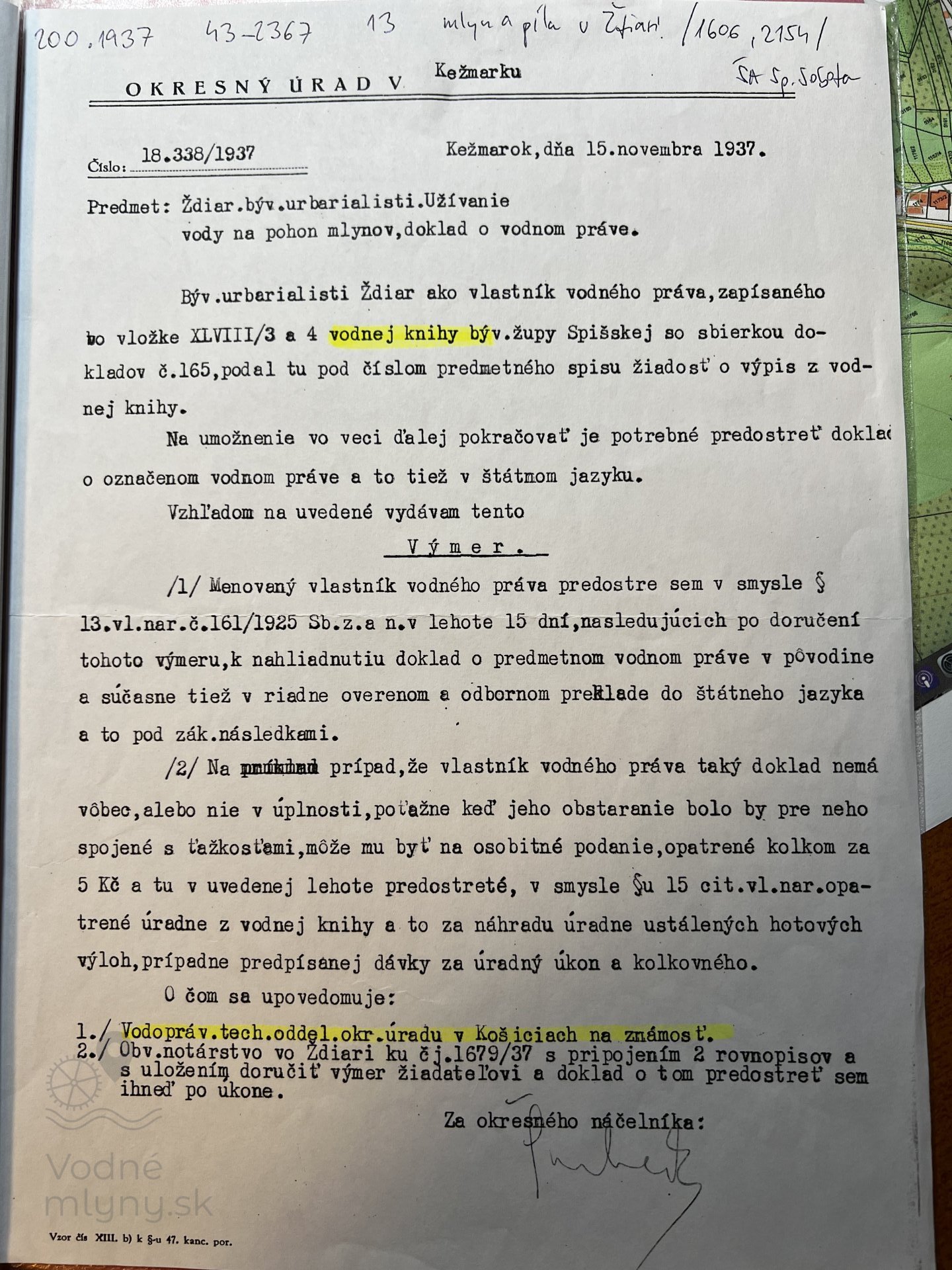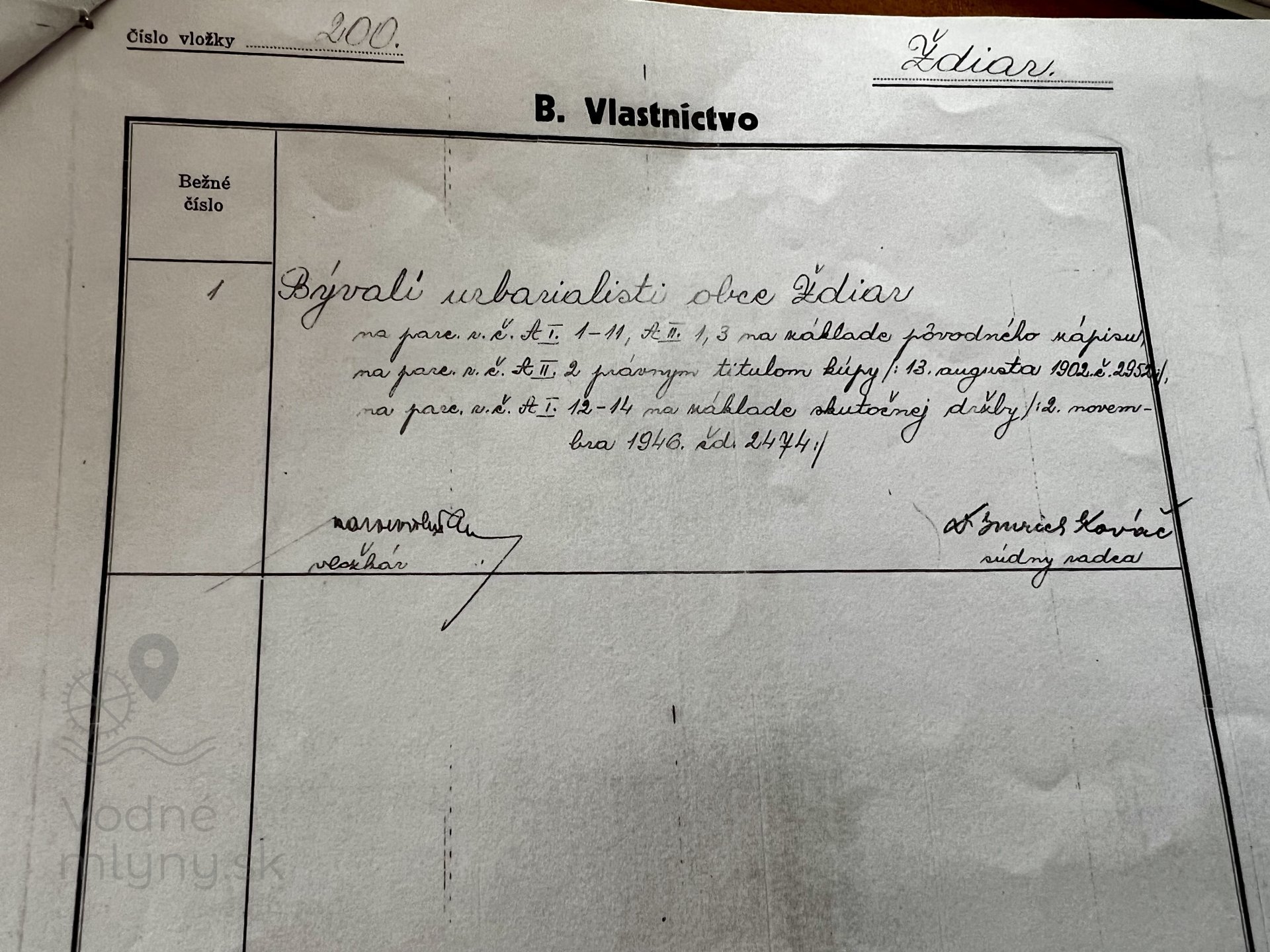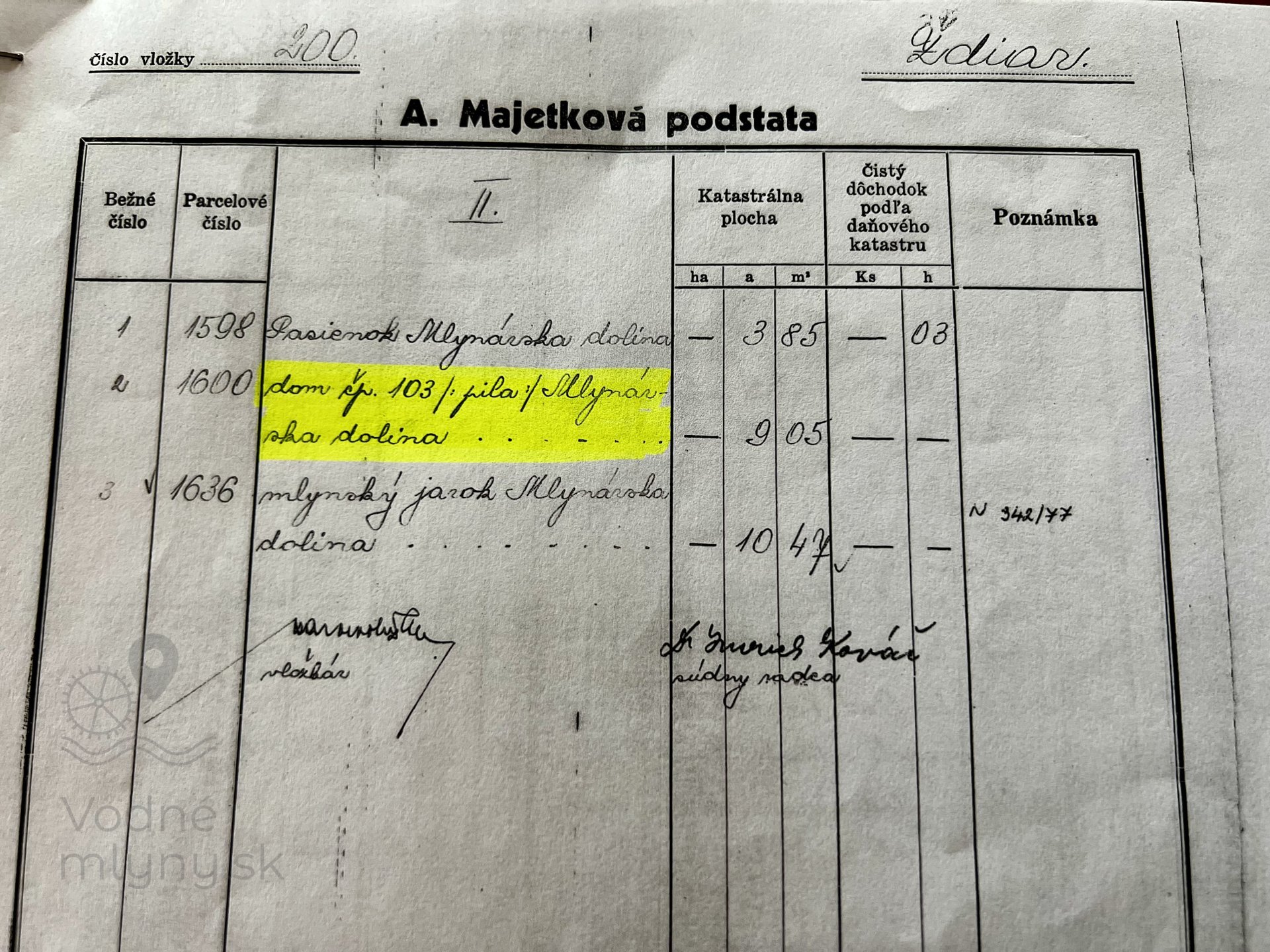 Podľa Pozemkovej knihy pre obec Ždiar, vo vložke 200 je pri majetkovej podstate uvedená parcela 1600 - dom č.p. 103 (píla) Mlynárska dolina