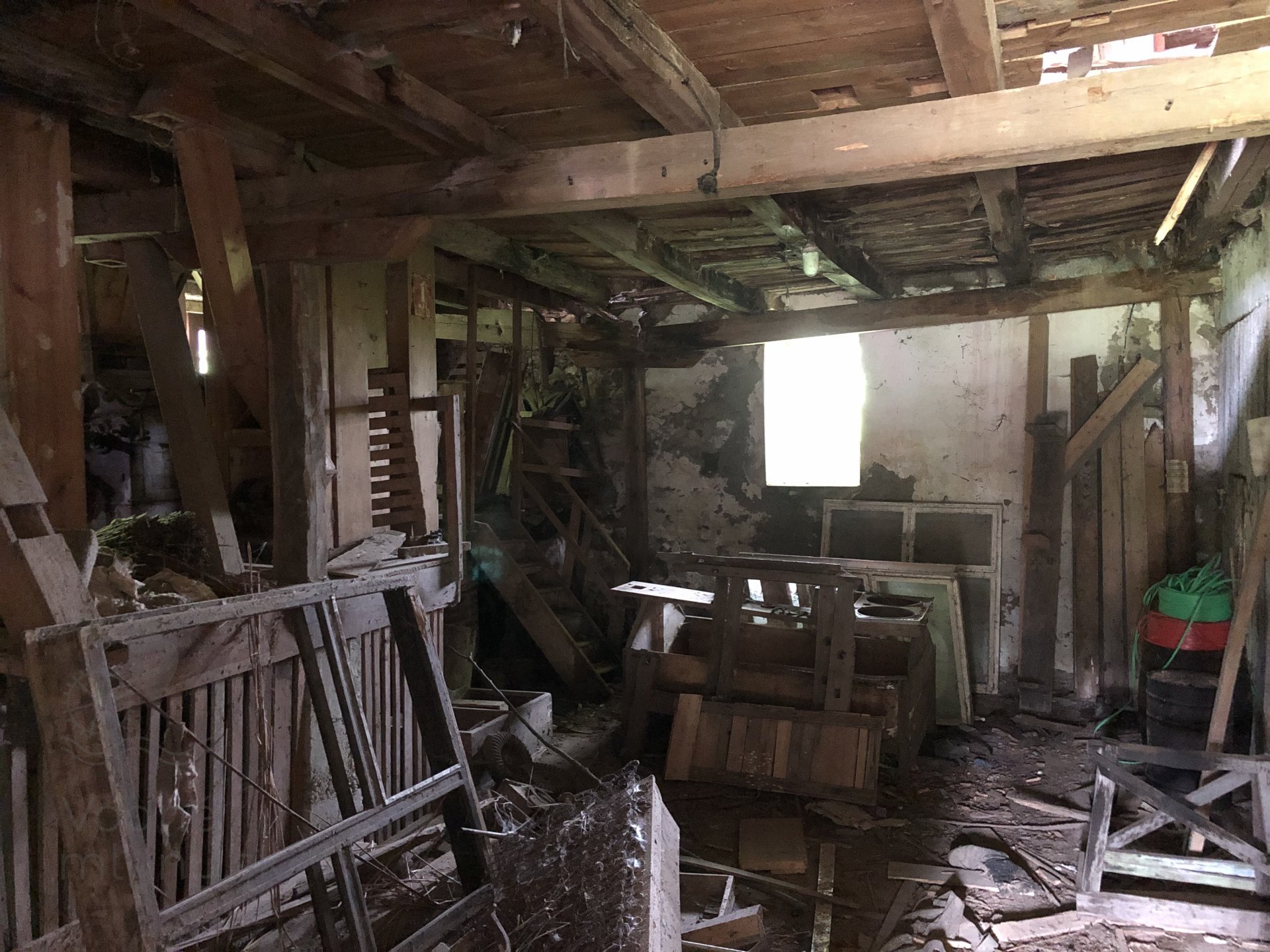 Transmisia v suteréne mlyna s remenicami, 2023, © Wagner, (Prvky na obrázku: transmisie, remenice, prevody, transmisie, remenice, prevody - ozubené kolesá, pastorky (priemyselne vyrobené), transmisie, remenice, prevody - transmisný hriadeľ s remenicami (vyrobenými priemyselne či remeselne))