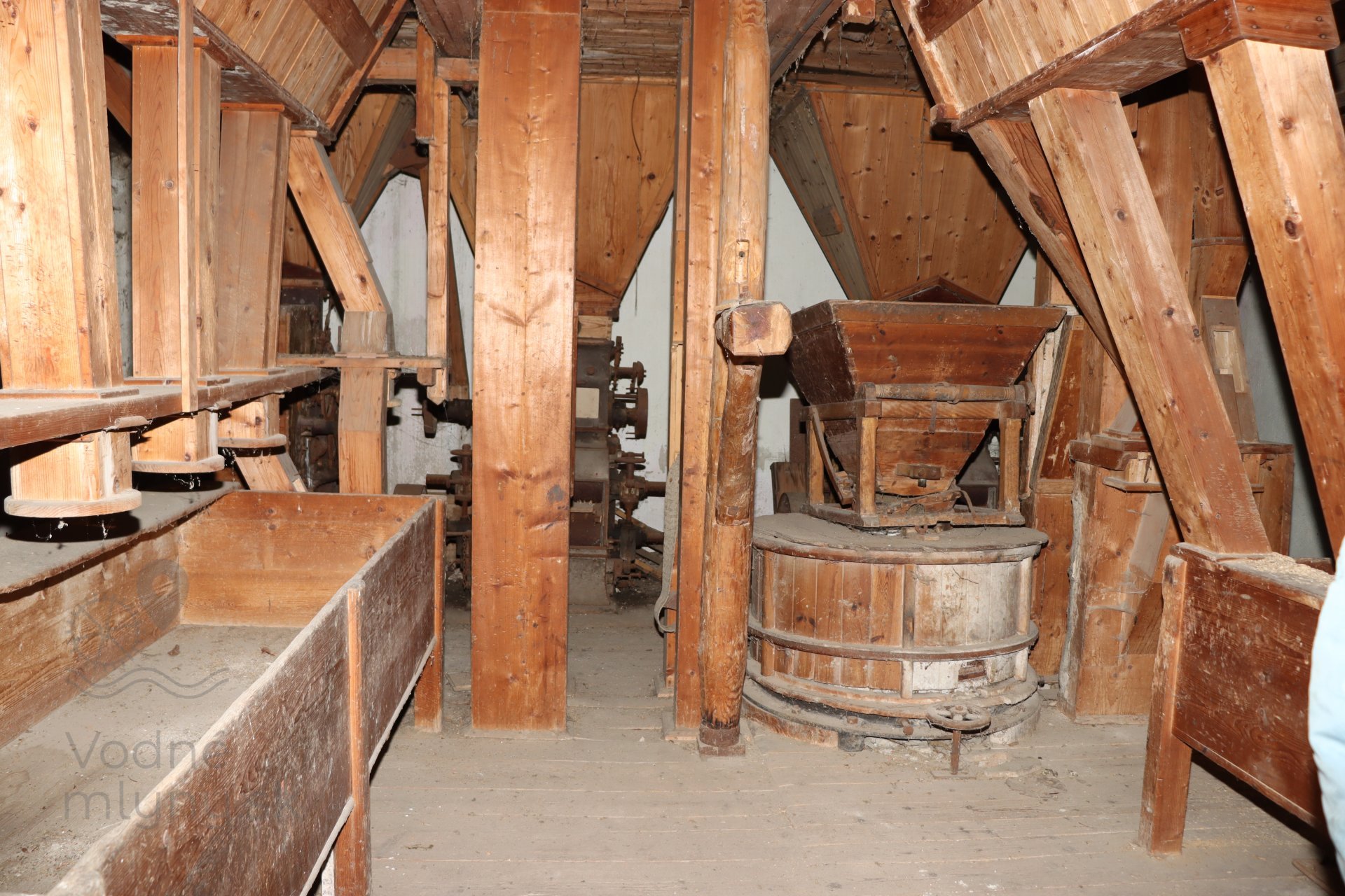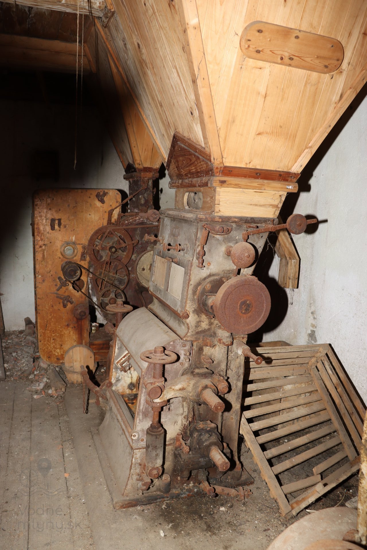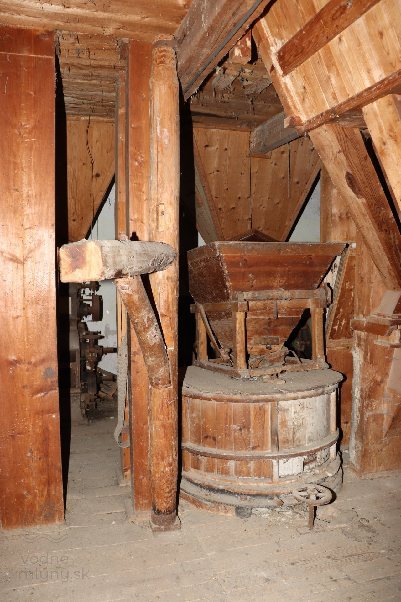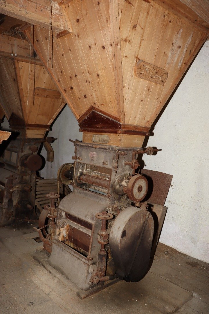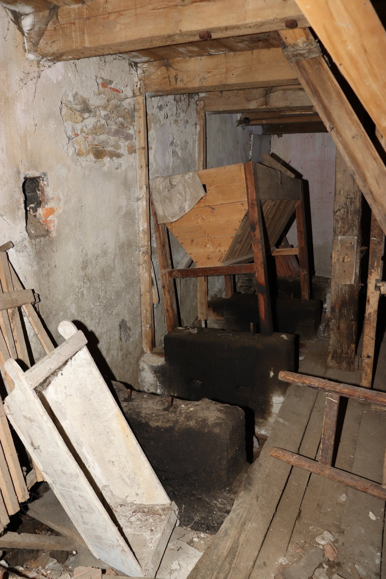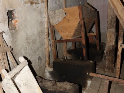 Mlecia podlaha s dvojicou mlecích stolíc, kamenným zložením, lúpačkou a výskokmi z hranolových vysievačov v podstreší, 2023, © Martin Petráš, (Prvky na obrázku: kamenné zloženie (šrotovacie, mlecie))