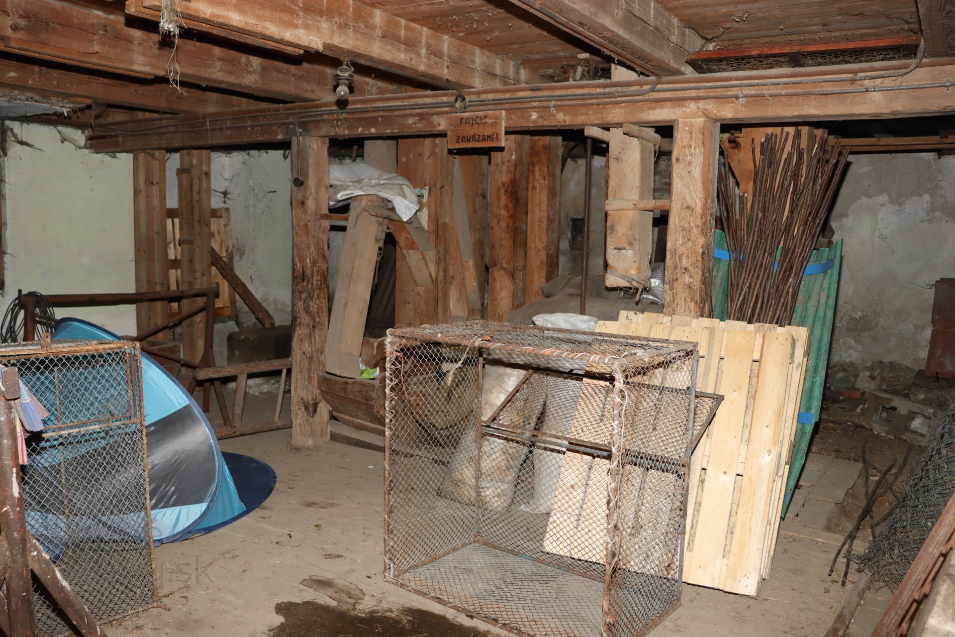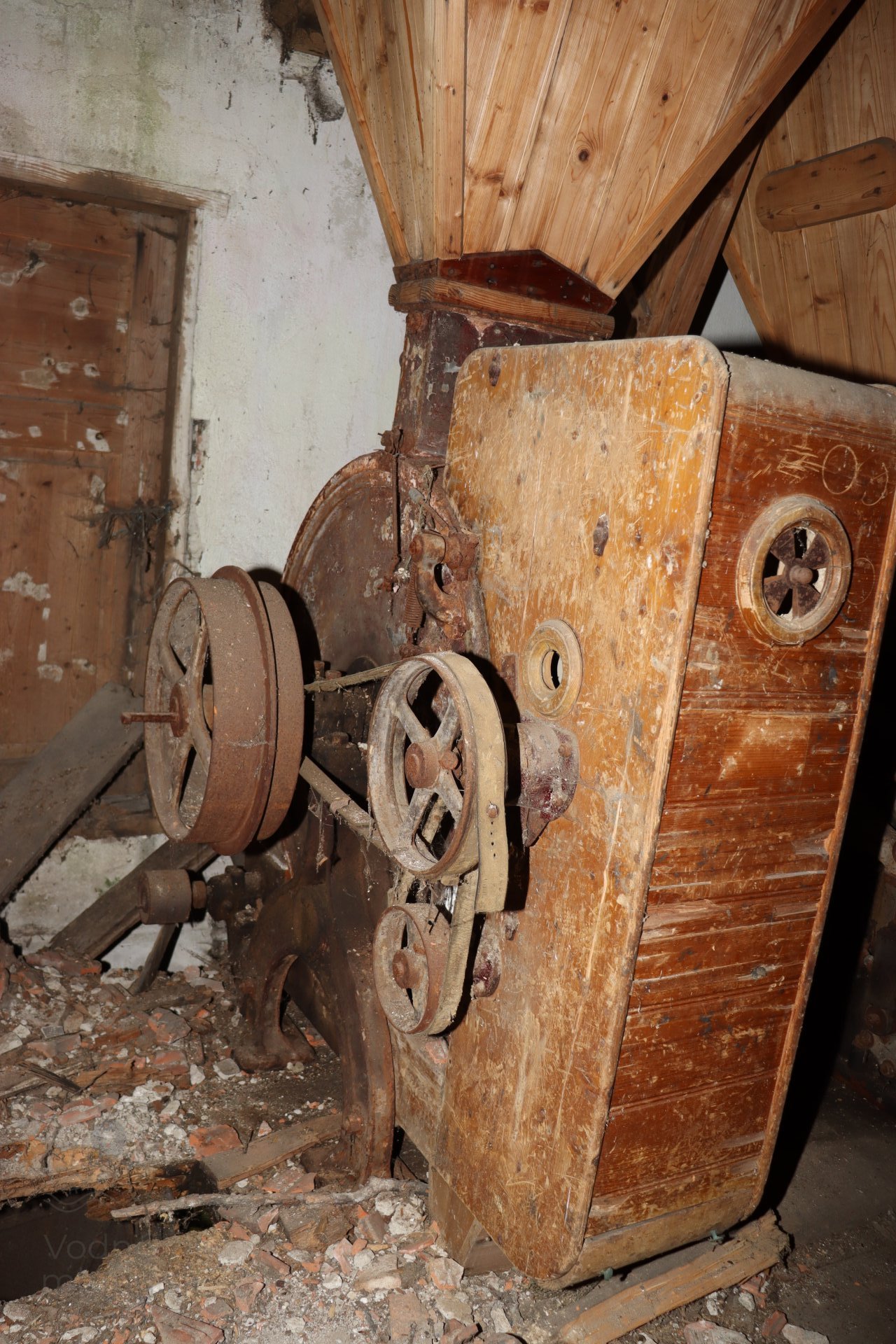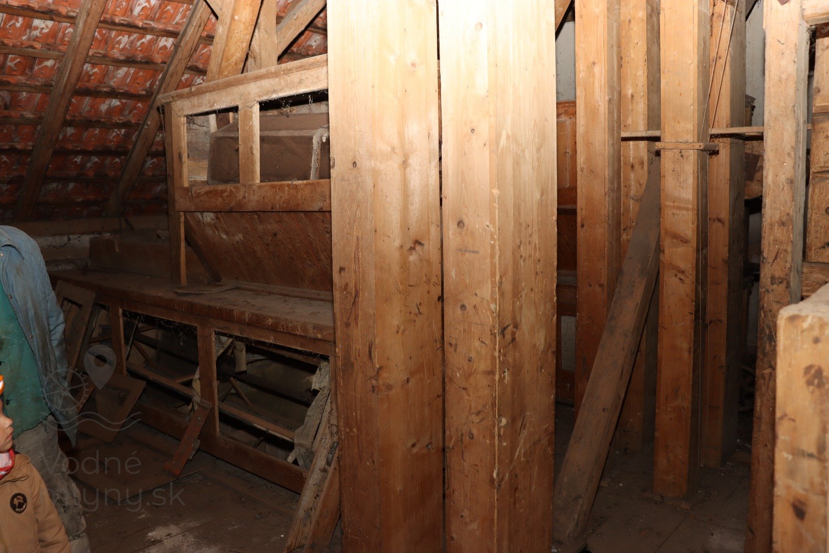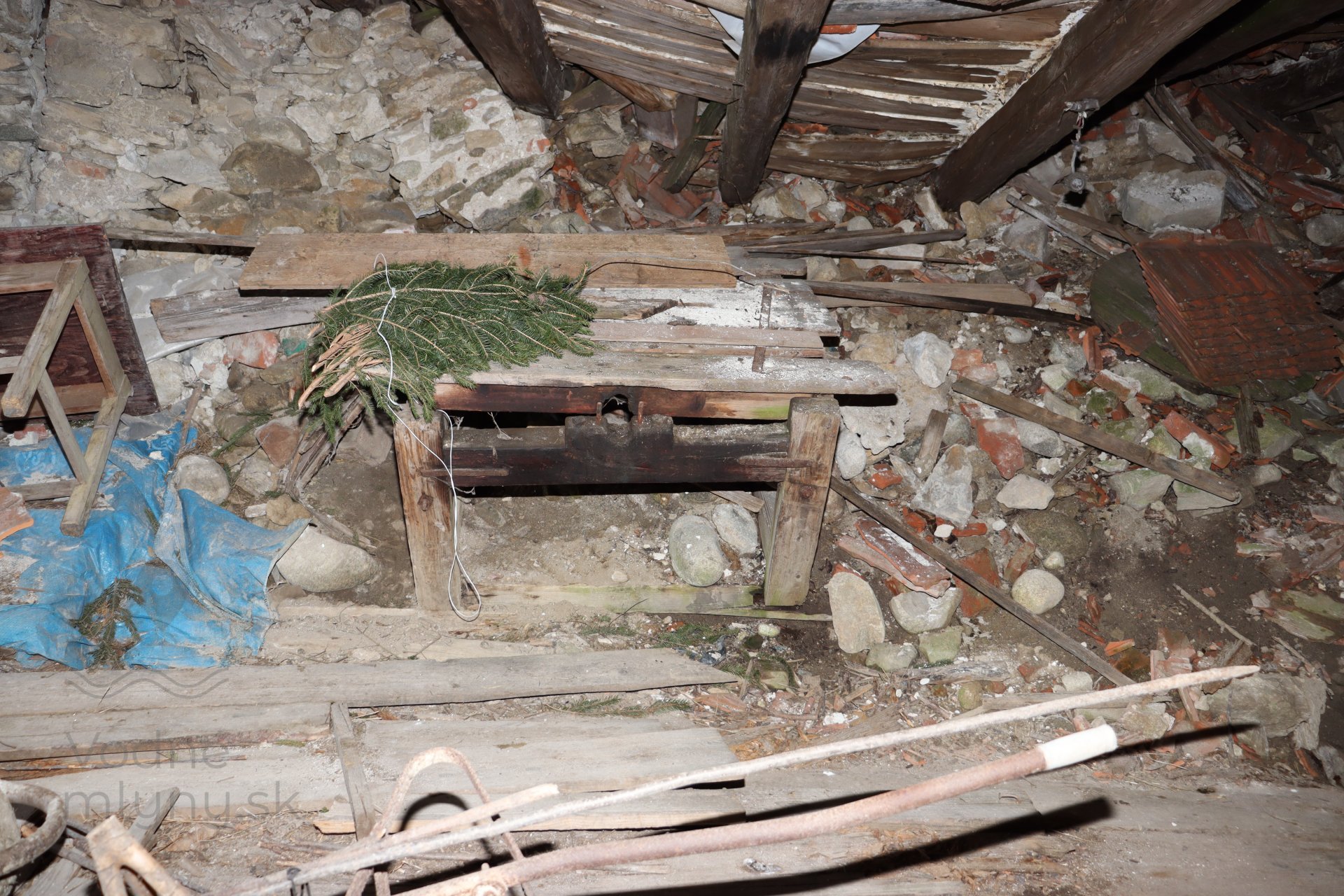 Mlecia podlaha s dvojicou mlecích stolíc, kamenným zložením, lúpačkou a výskokmi z hranolových vysievačov v podstreší, 2023, © Martin Petráš, (Prvky na obrázku: kamenné zloženie (šrotovacie, mlecie))