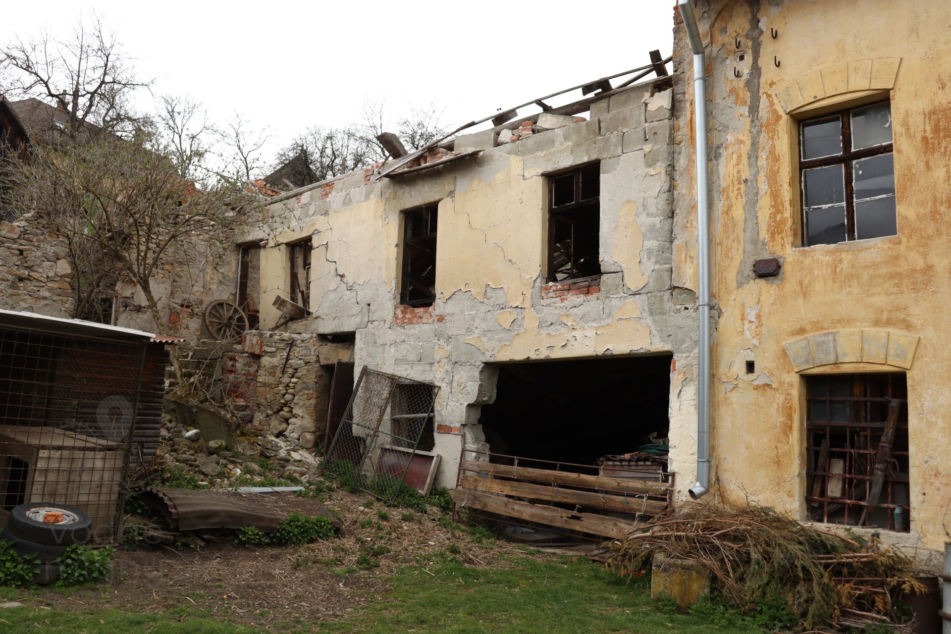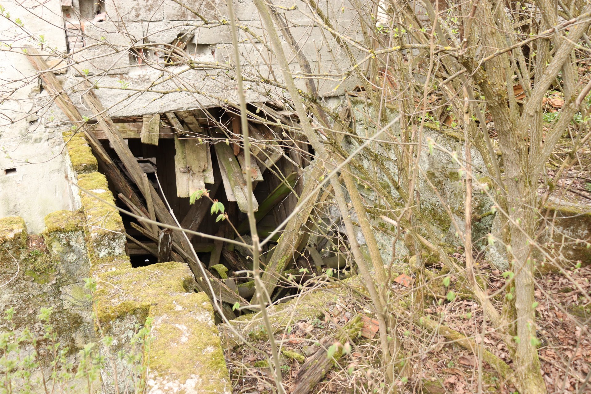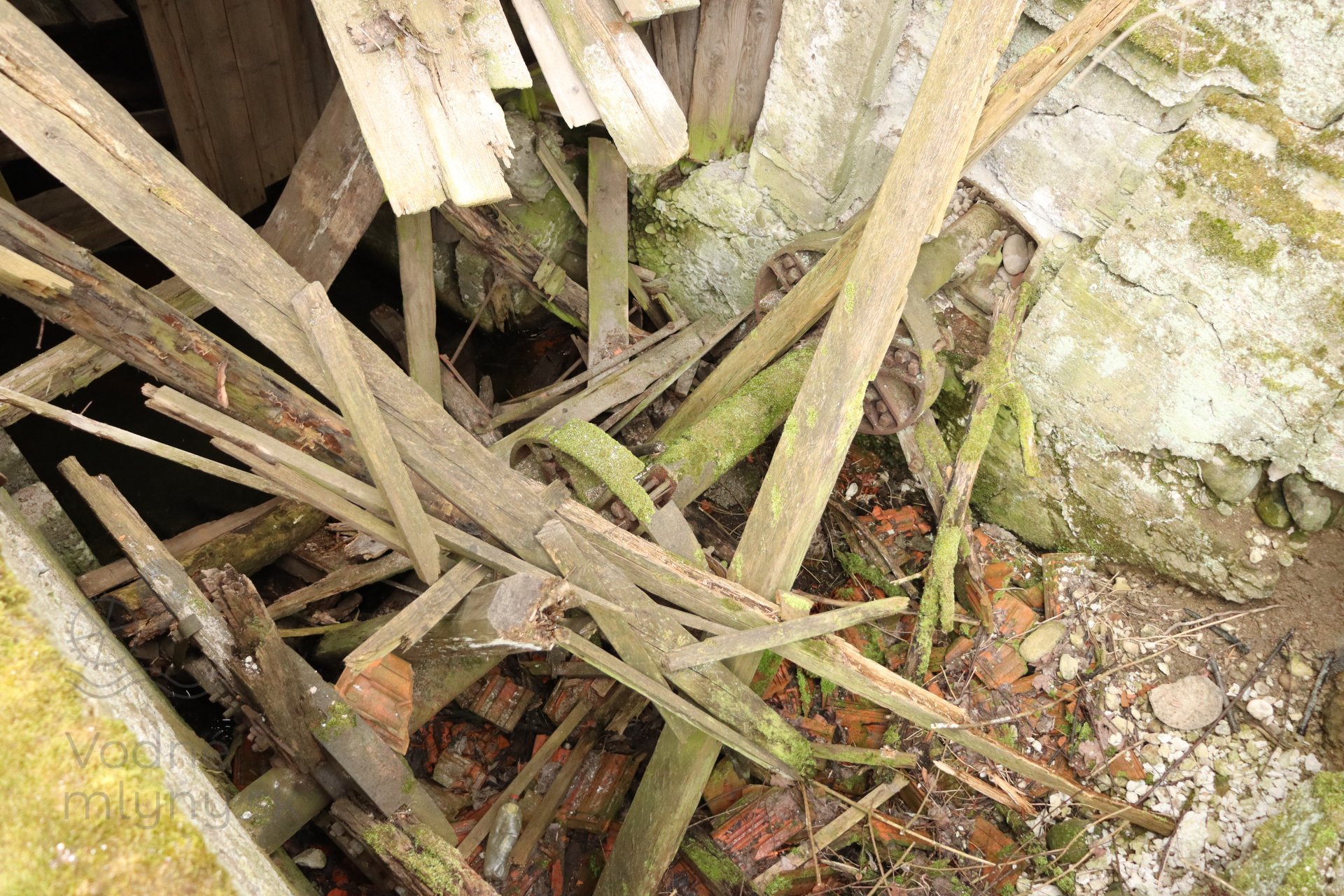 Pohľad na zrútenú časť mlyna s netypickým priechodom do ráštubne mohutného vodného kolesa, 2023, © Martin Petráš