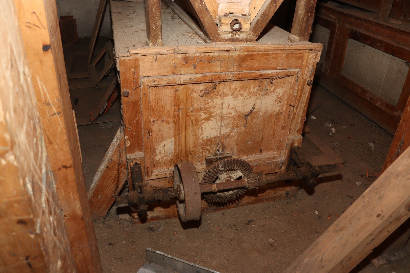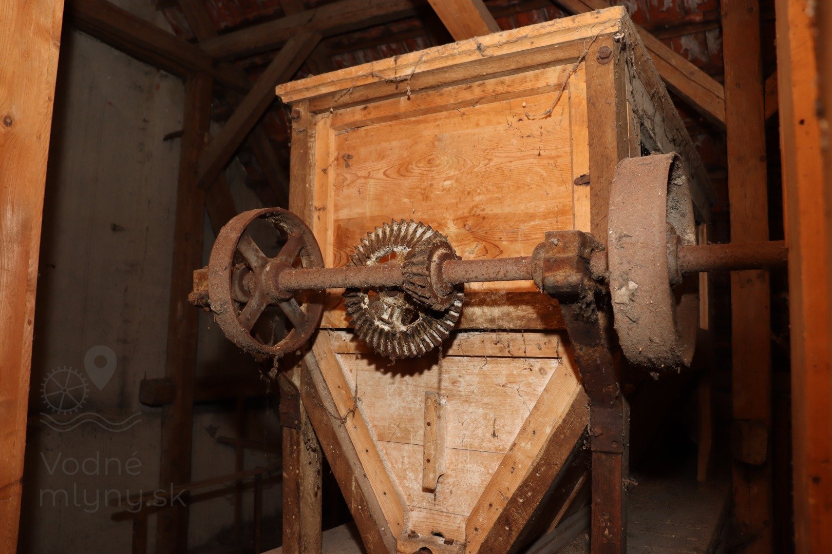 Palečné koleso na hriadeli vodného kolesa, 2023, © Martin Petráš, (Prvky na obrázku: transmisie, remenice, prevody, transmisie, remenice, prevody - ozubené kolesá, pastorky (priemyselne vyrobené))