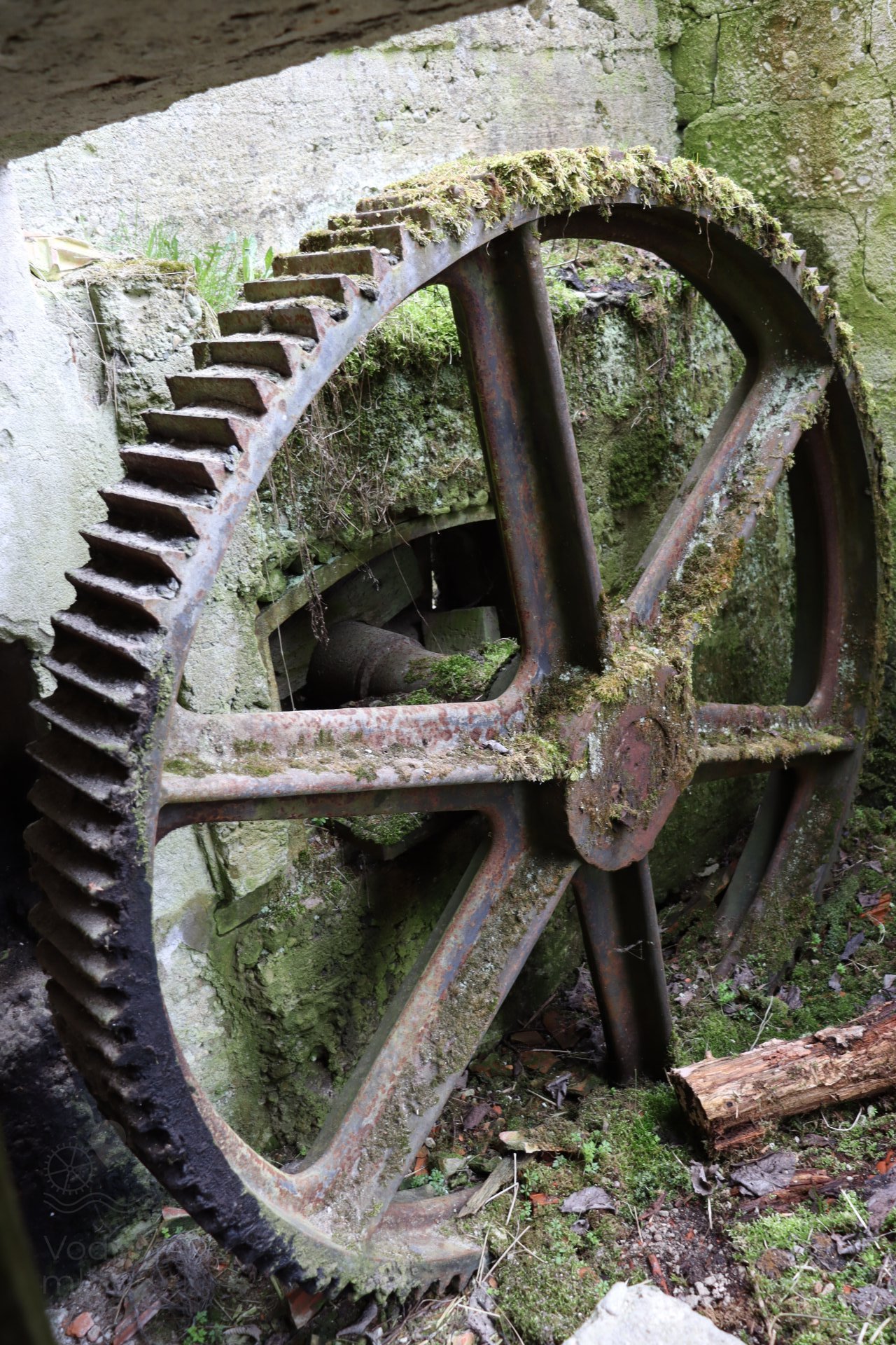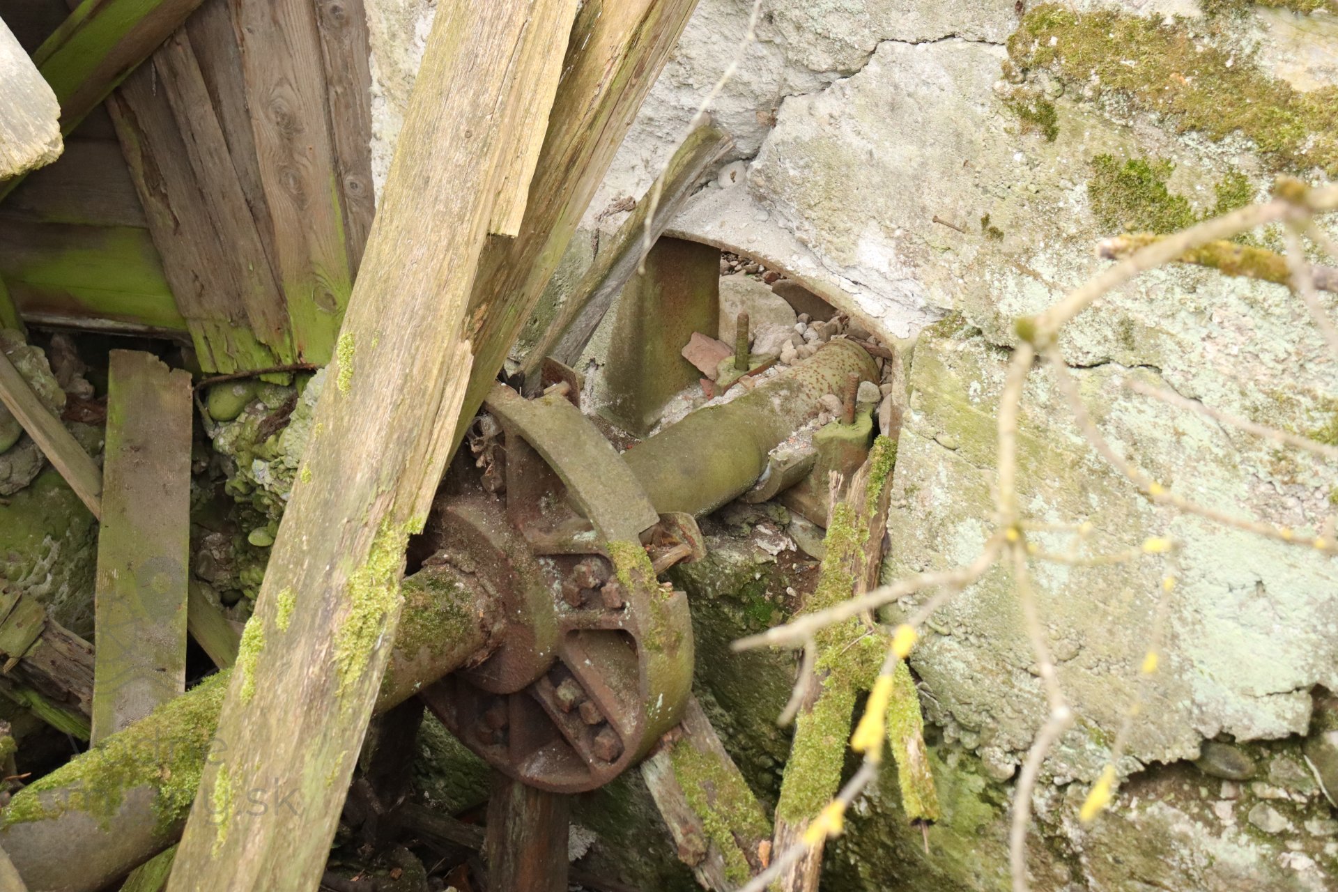 Torzo mohutného trojkružného vodného kolesa s liatinovými rozetami, 2023, © Martin Petráš, (Prvky na obrázku: Vodné koleso)
