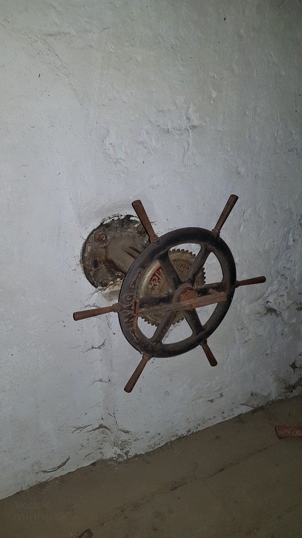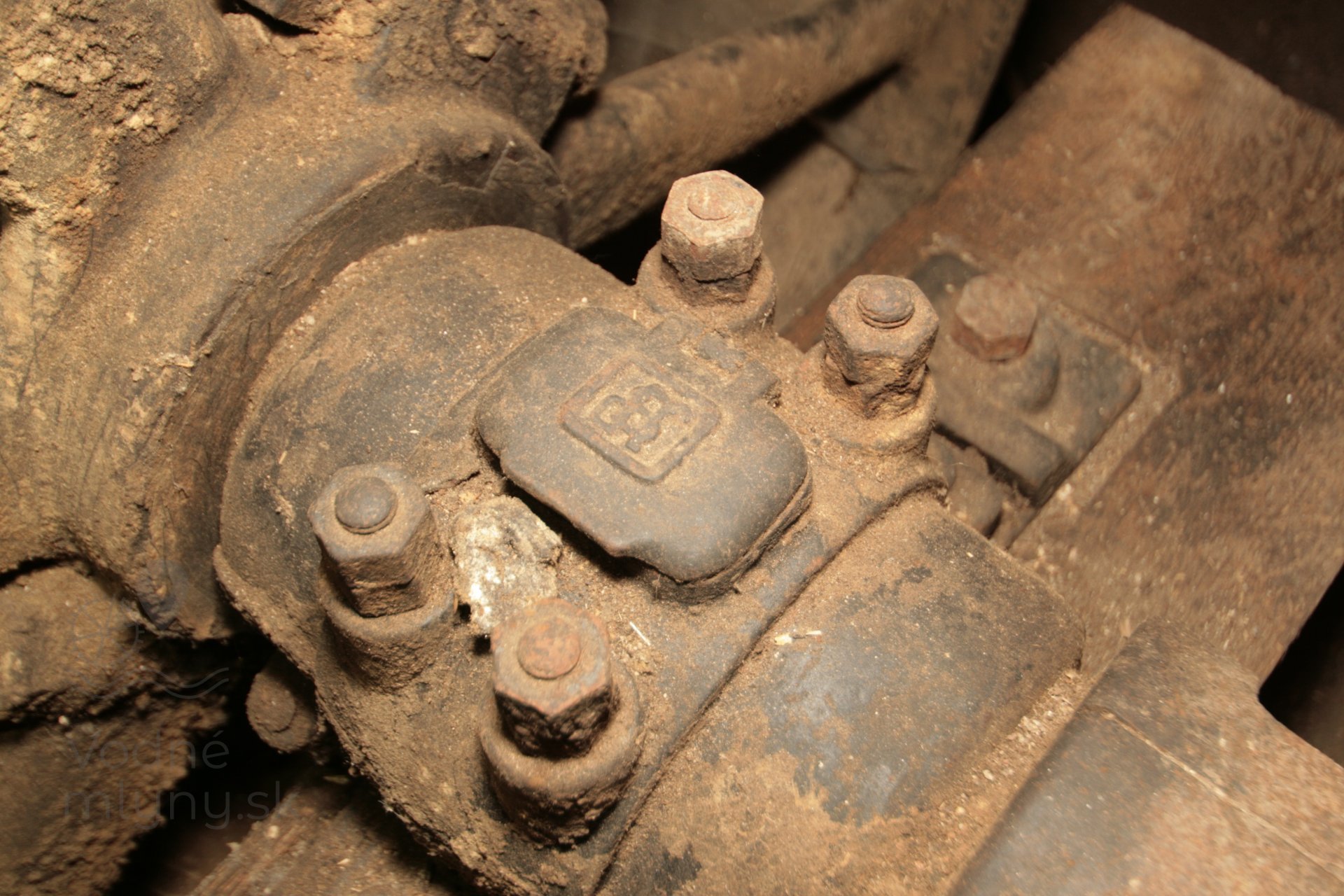 Prevod zo zvislého hriadeľa turbíny na predlohovú transmisiu, 2019, © Martin Petráš, (Prvky na obrázku: Turbína, značka výrobcu na vodnom motore)