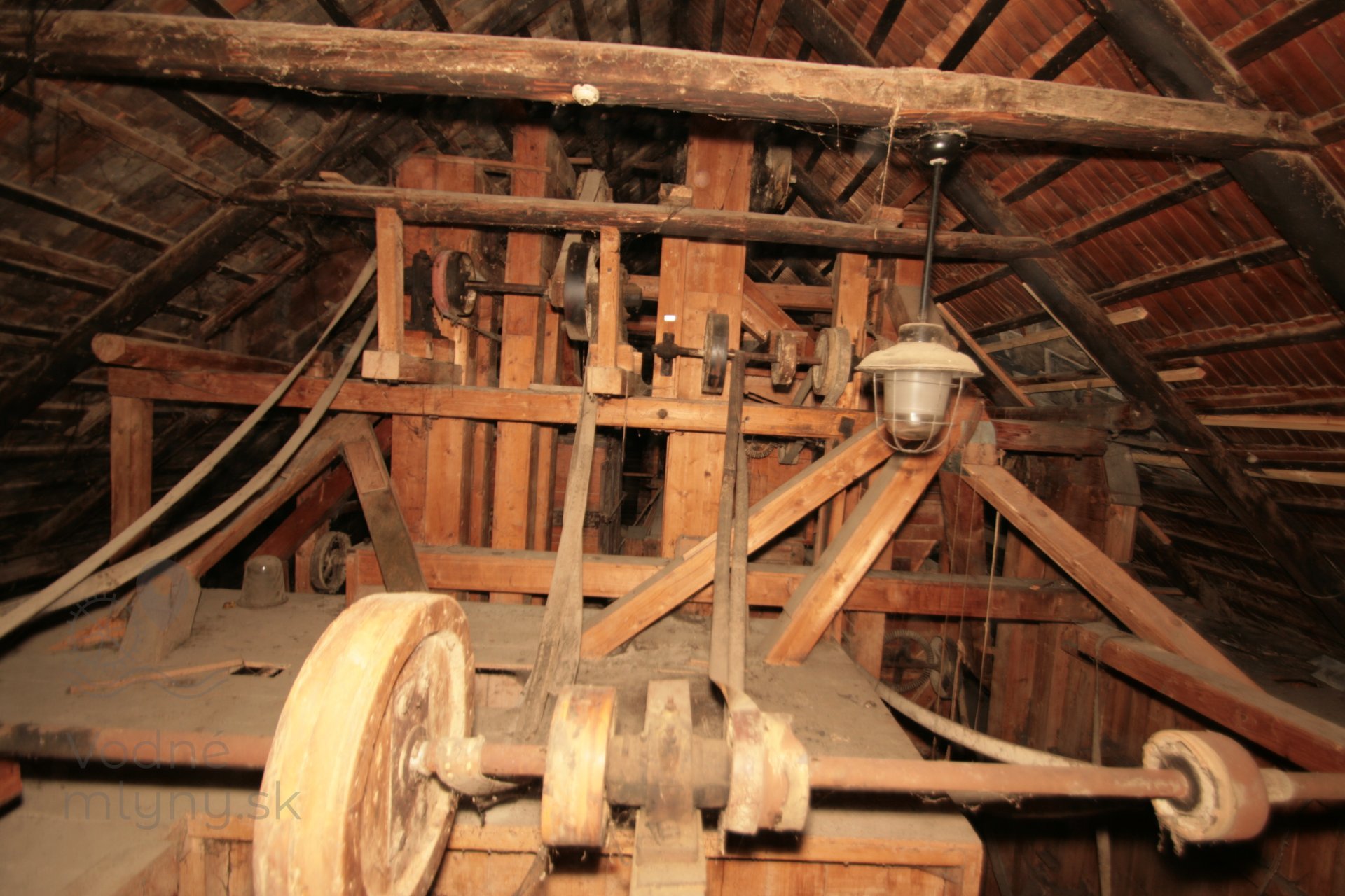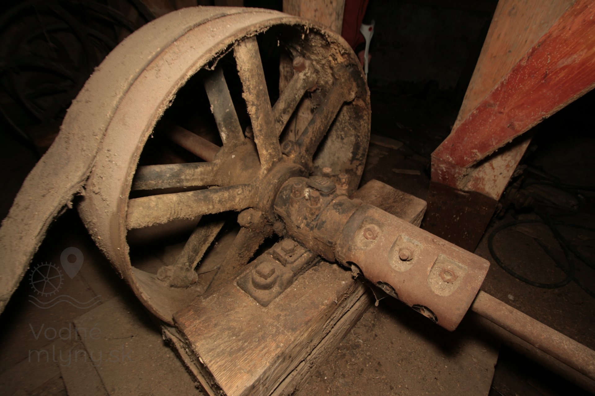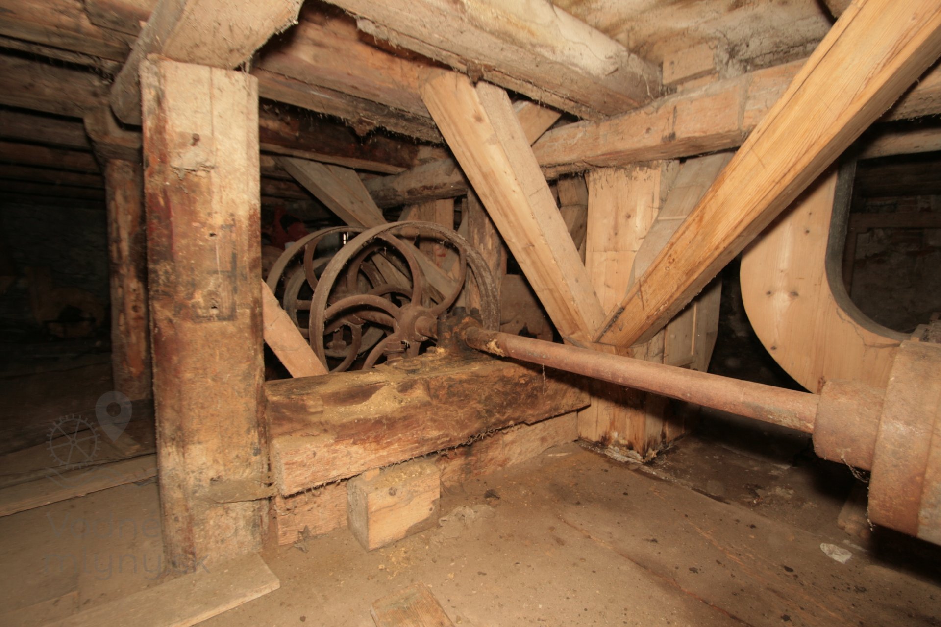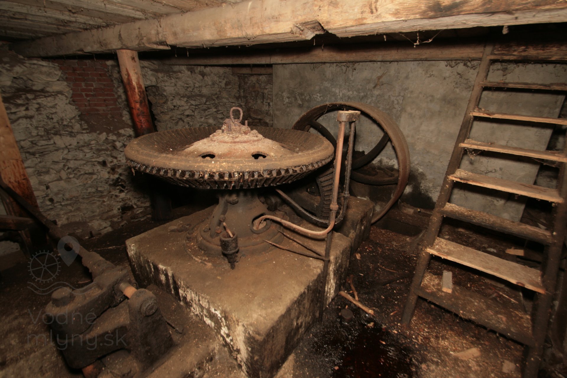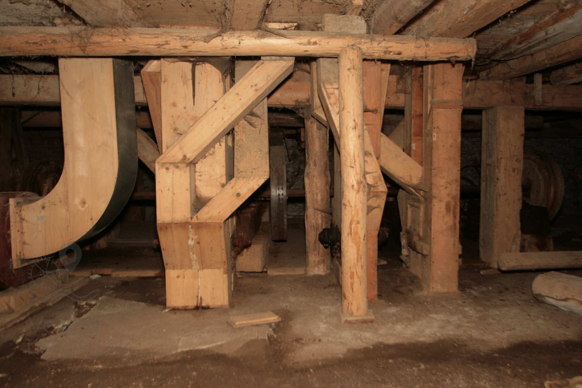 Pohľad na transmisiu v podkolí. Ložiská upevnené na sekundárne použitých častiach mlynskej hranice, 2019, © Martin Petráš, (Prvky na obrázku: transmisie, remenice, prevody)