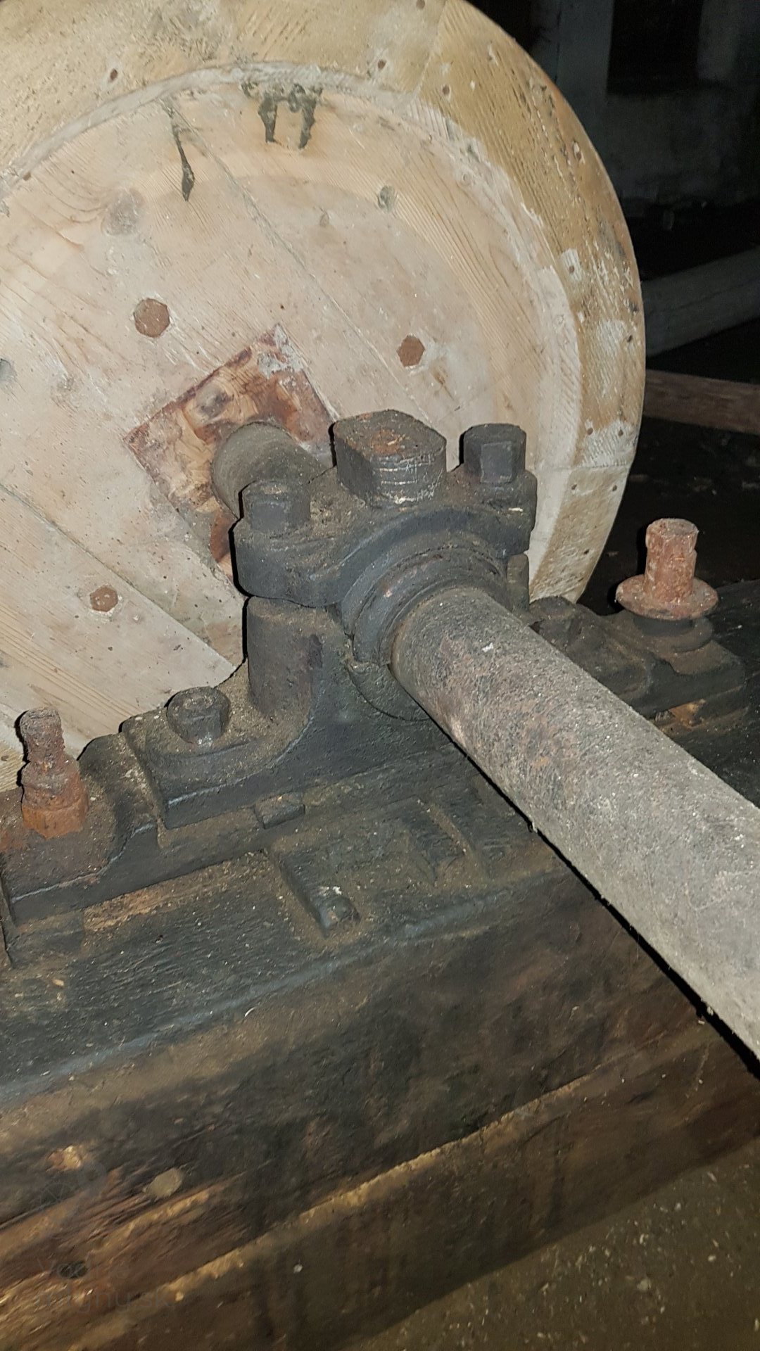 Detail ložiska transmisie podstatne staršej konštrukcie, 2019, © Martin Petráš, (Prvky na obrázku: transmisie, remenice, prevody)