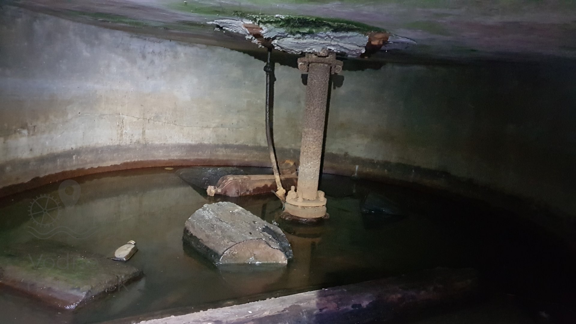 Zvislý hriadeľ turbíny v čiastočne zatopenej turbínovej komore, 2021, © Martin Petráš, (Prvky na obrázku: turbínová šachta)