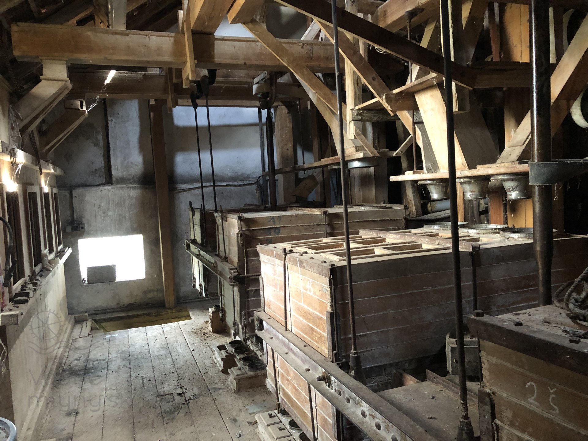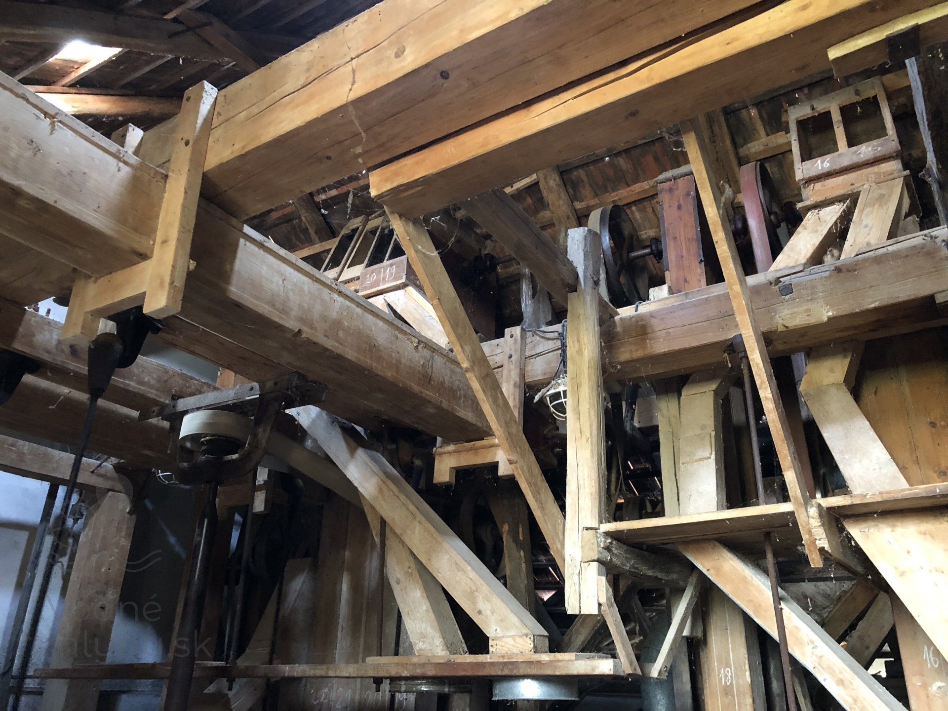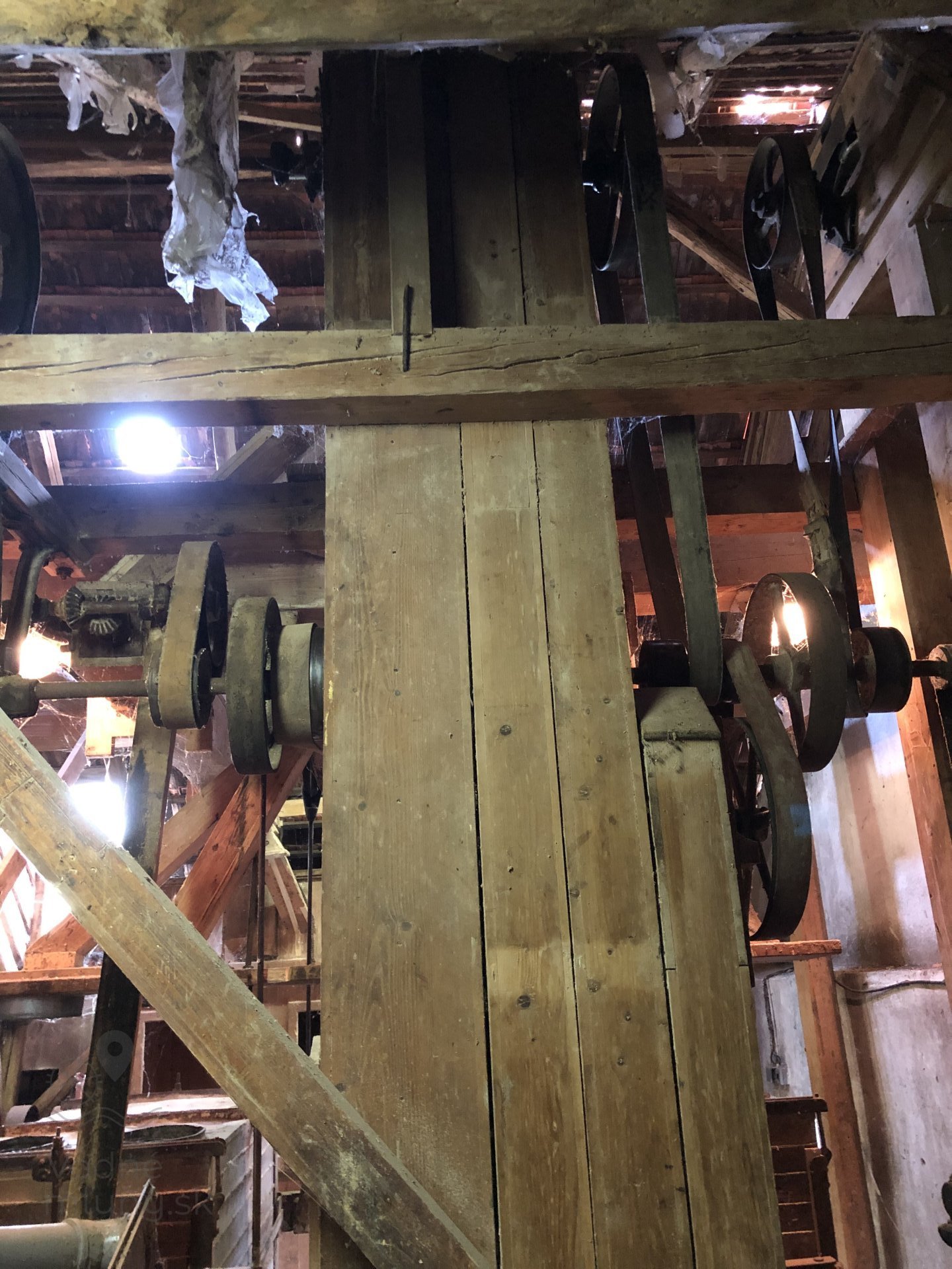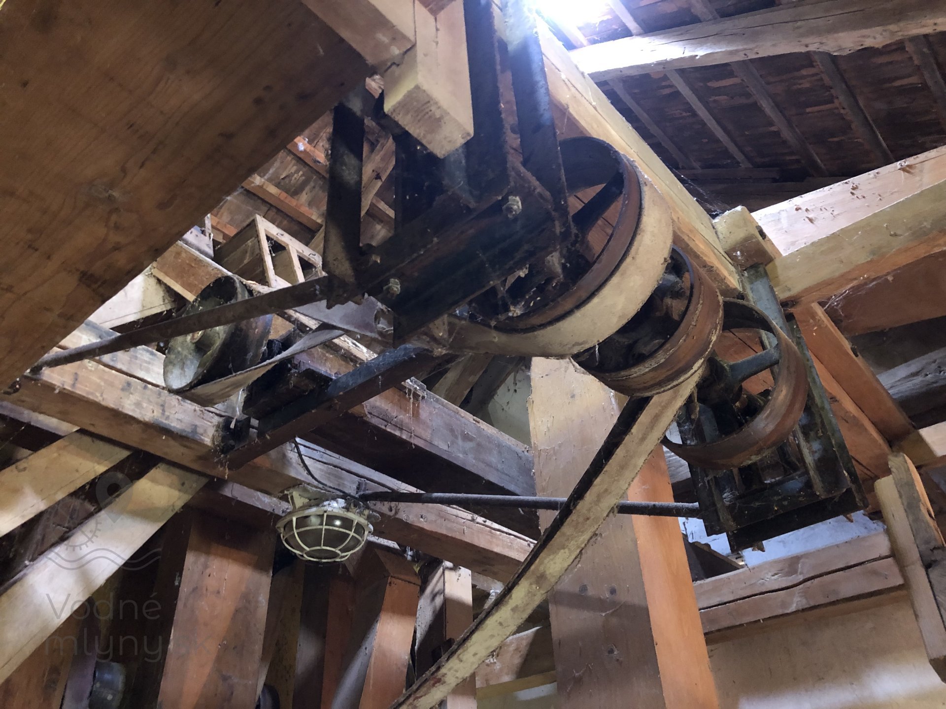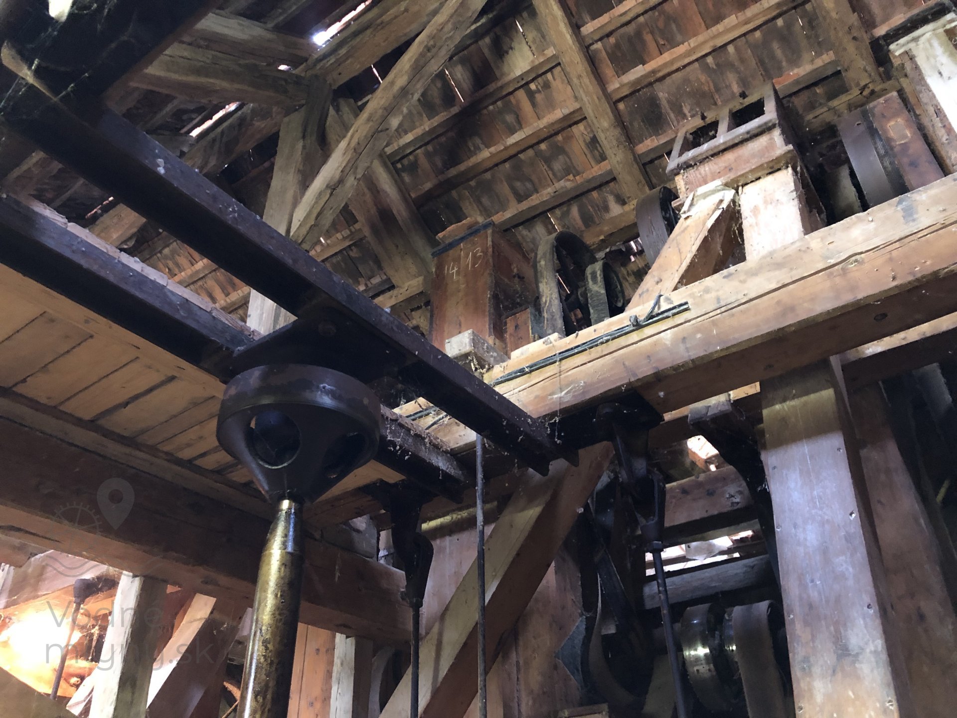 Transmisia v podkroví mlyna, 2023, © Wagner, (Prvky na obrázku: transmisie, remenice, prevody, transmisie, remenice, prevody - ozubené kolesá, pastorky (priemyselne vyrobené), transmisie, remenice, prevody - transmisný hriadeľ s remenicami (vyrobenými priemyselne či remeselne), výťahy a dopravníky)