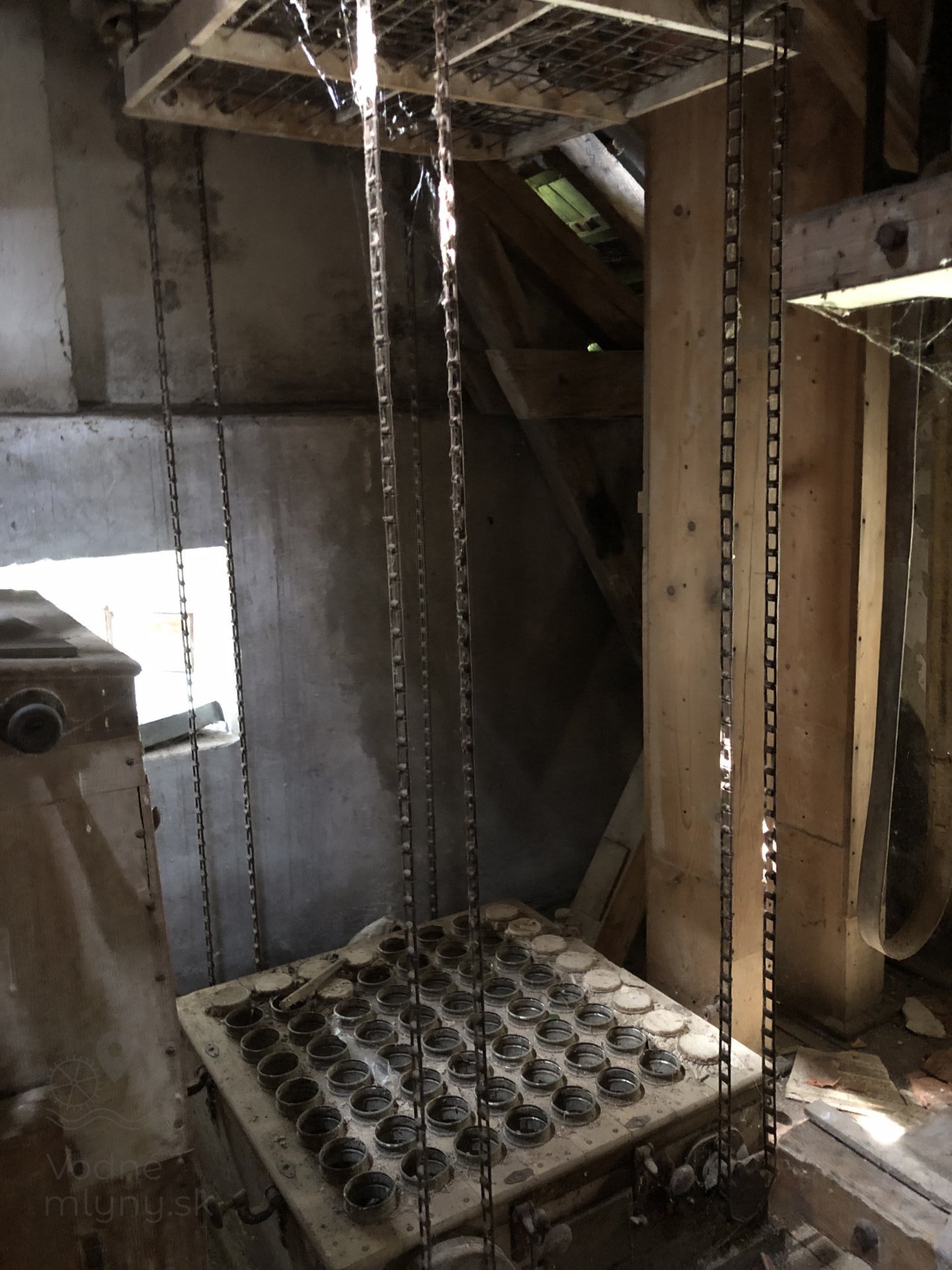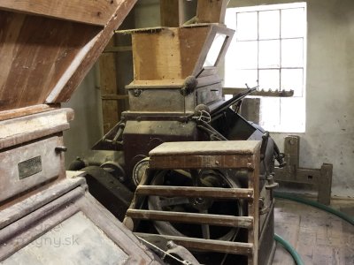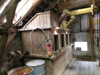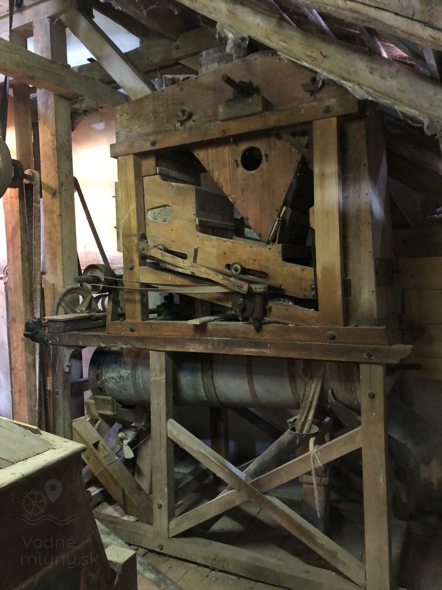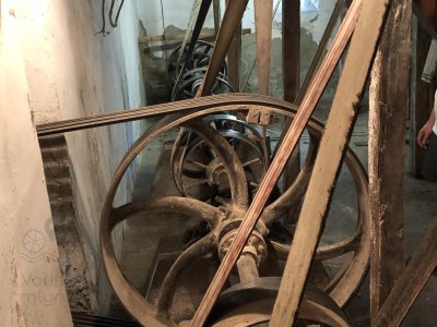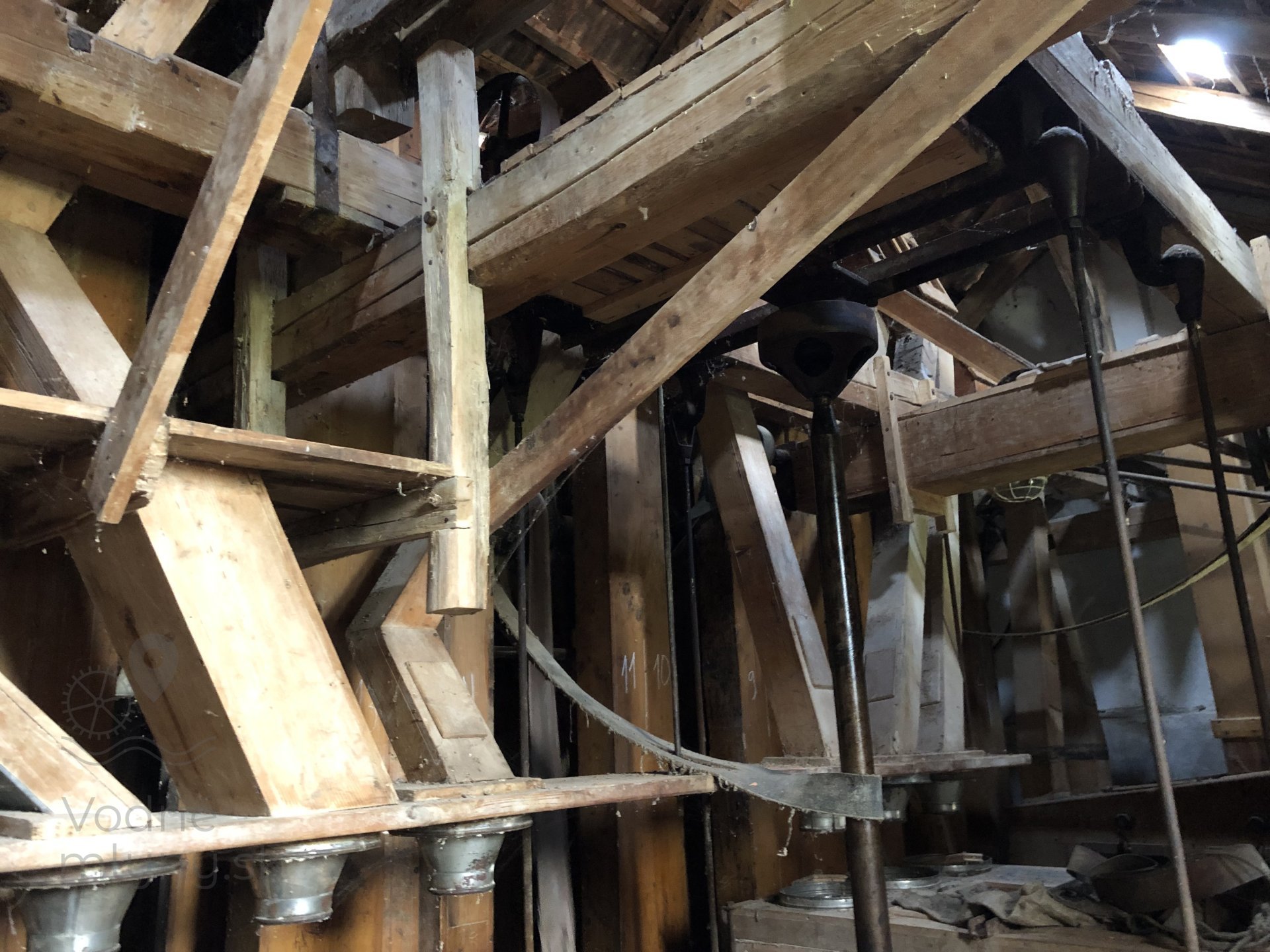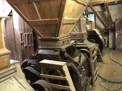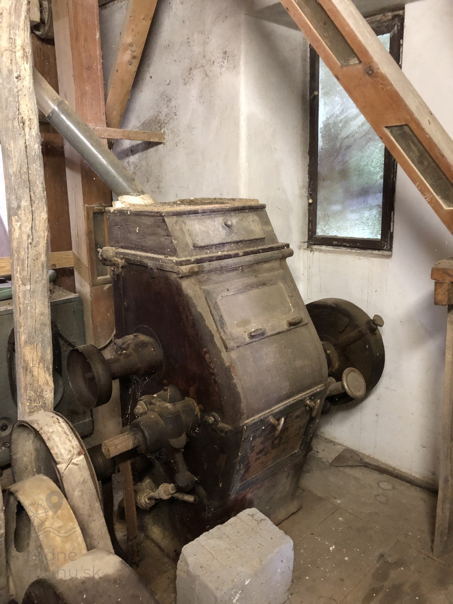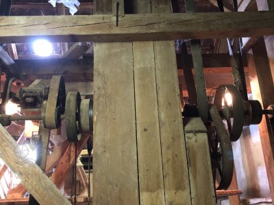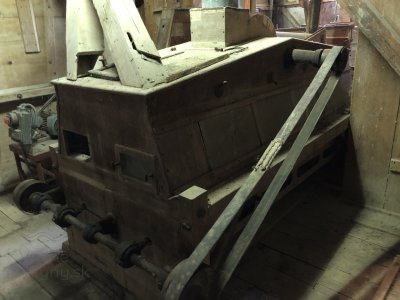 Transmisia v podkroví mlyna, 2023, © Wagner, (Prvky na obrázku: transmisie, remenice, prevody, transmisie, remenice, prevody - ozubené kolesá, pastorky (priemyselne vyrobené), transmisie, remenice, prevody - transmisný hriadeľ s remenicami (vyrobenými priemyselne či remeselne), výťahy a dopravníky)