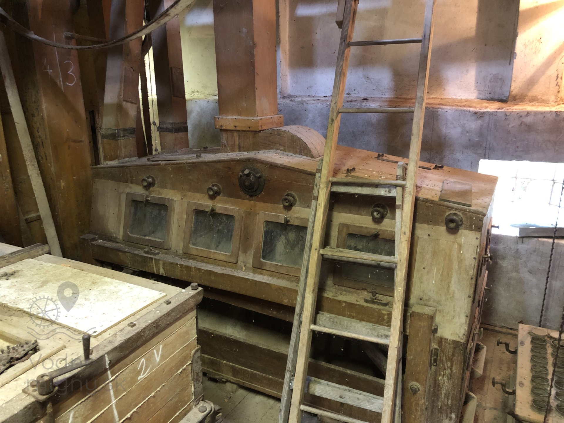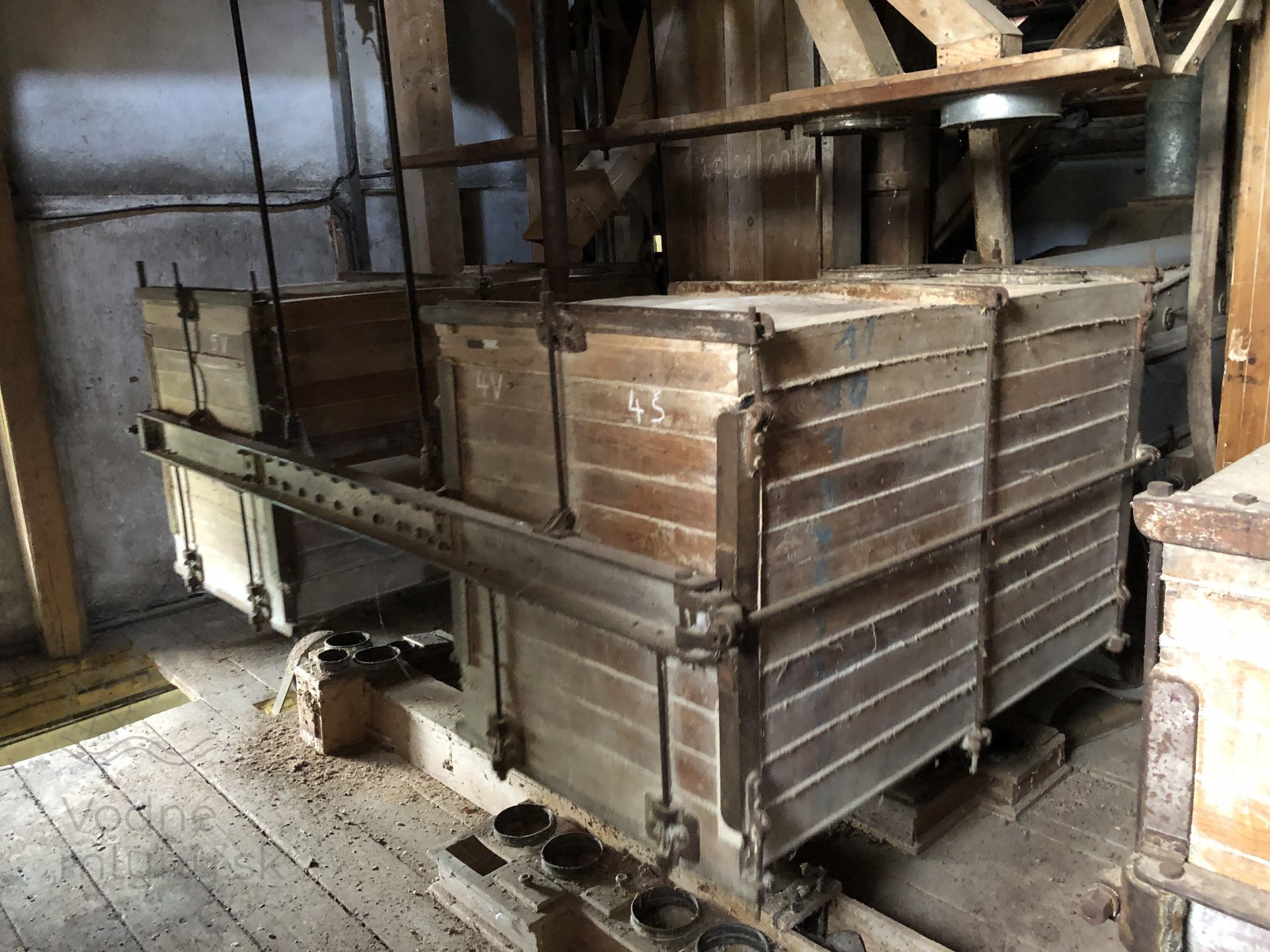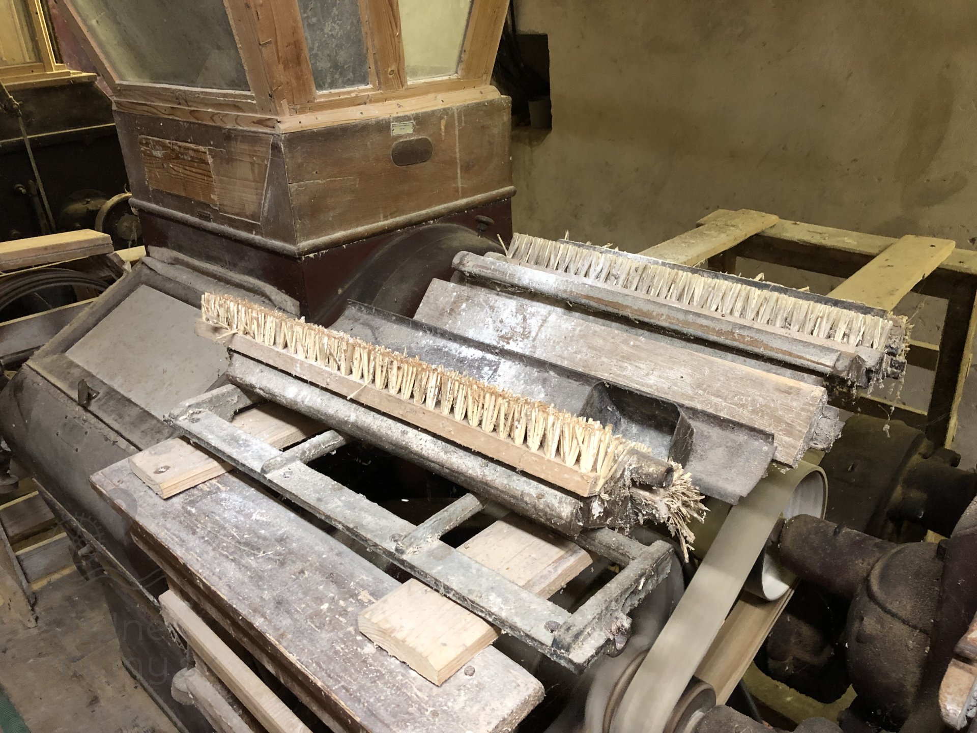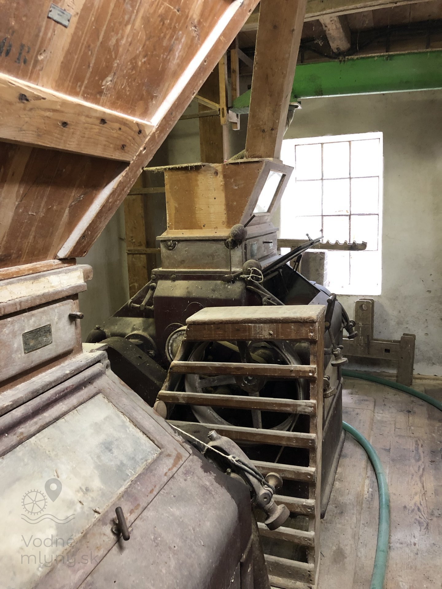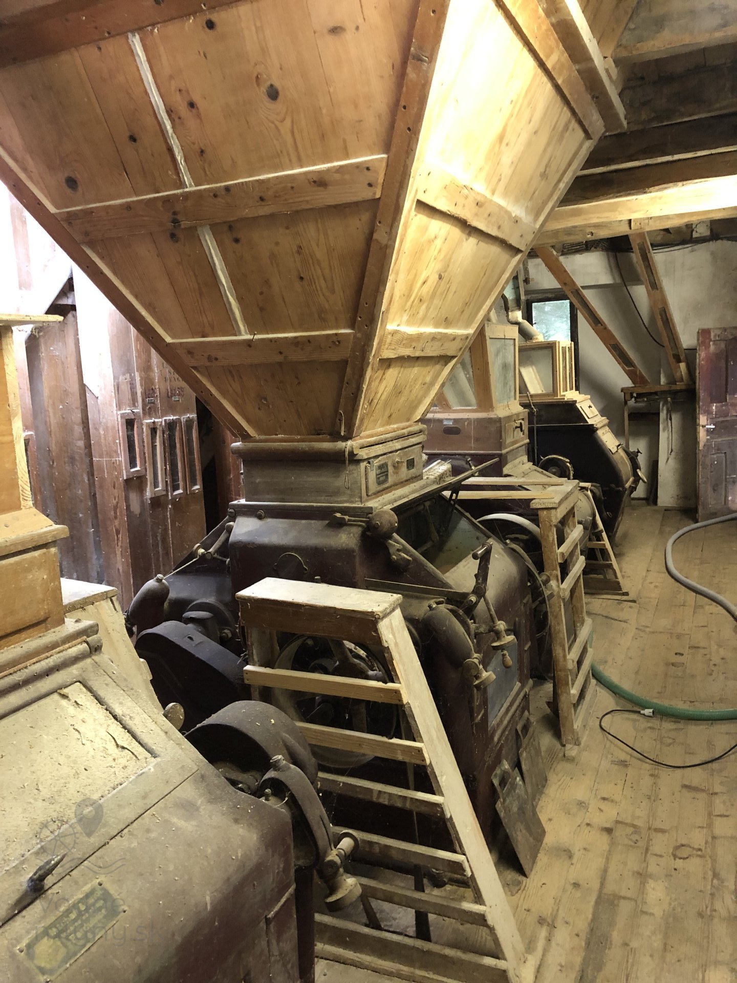 Transmisia v podkroví mlyna, 2023, © Wagner, (Prvky na obrázku: transmisie, remenice, prevody, transmisie, remenice, prevody - ozubené kolesá, pastorky (priemyselne vyrobené), transmisie, remenice, prevody - transmisný hriadeľ s remenicami (vyrobenými priemyselne či remeselne), výťahy a dopravníky)