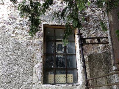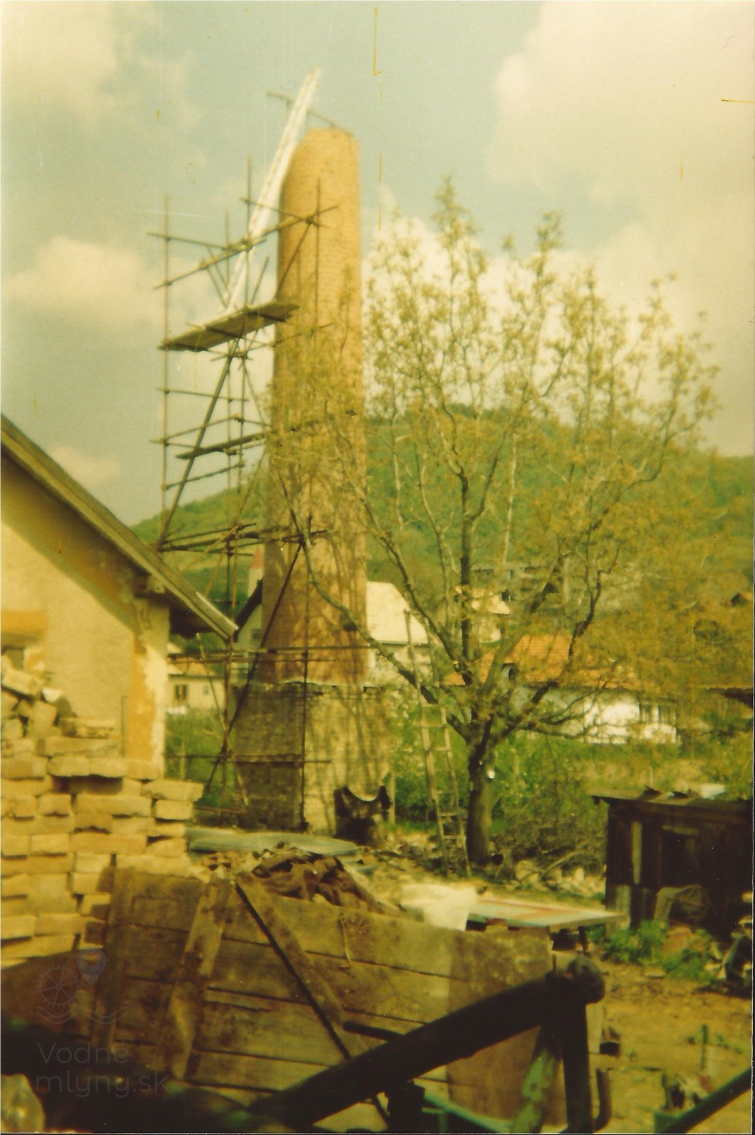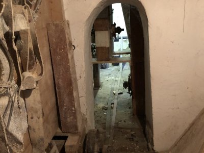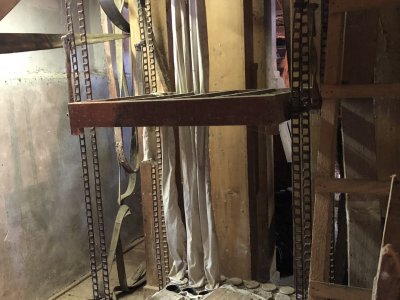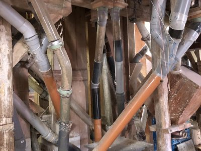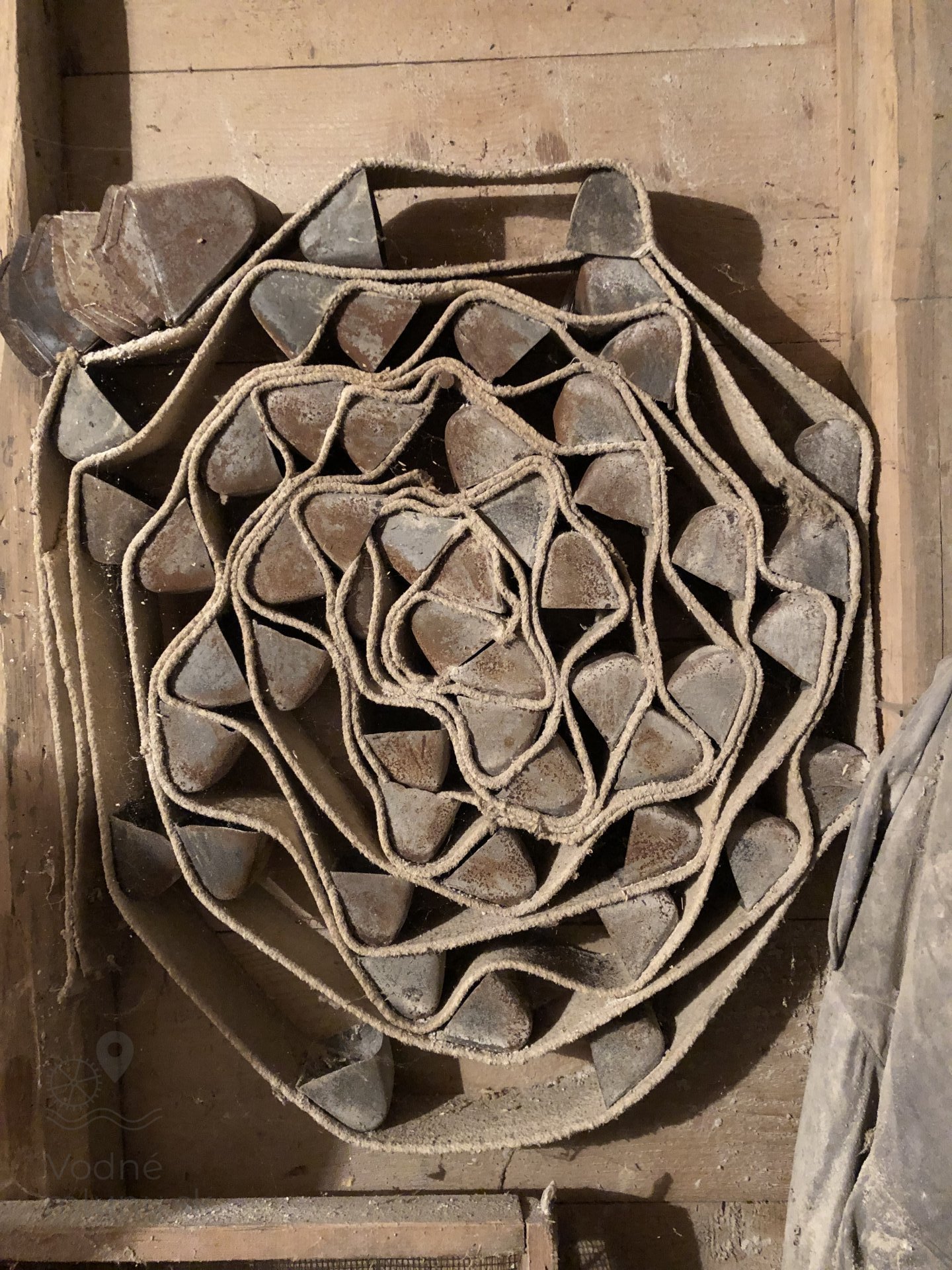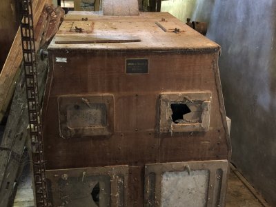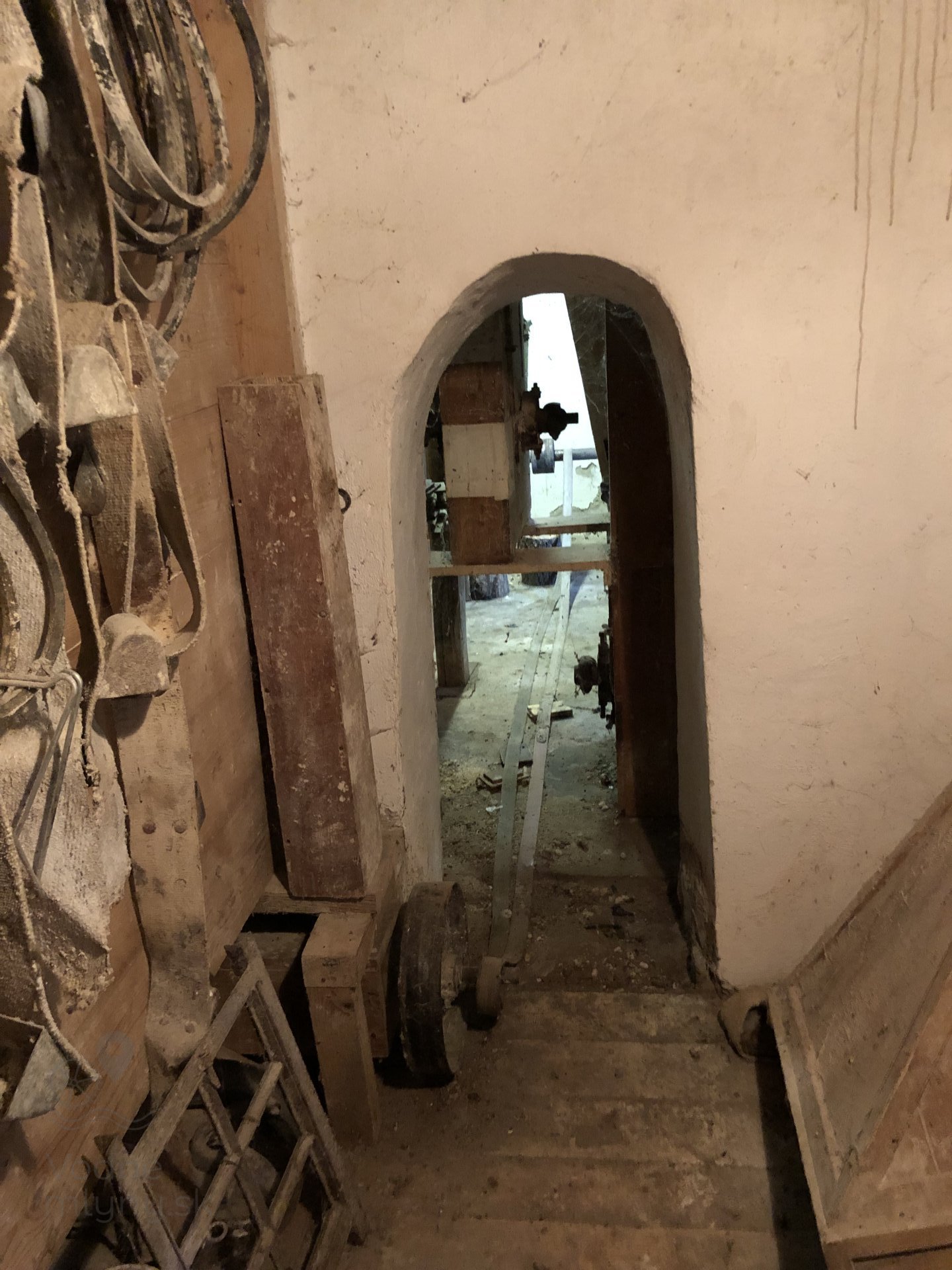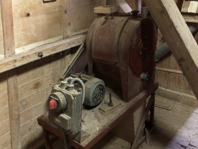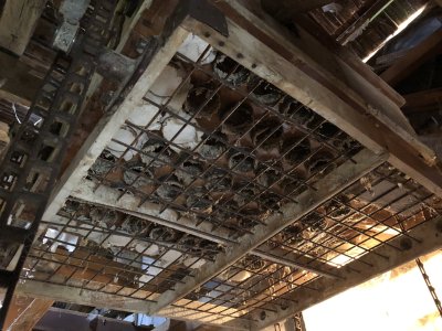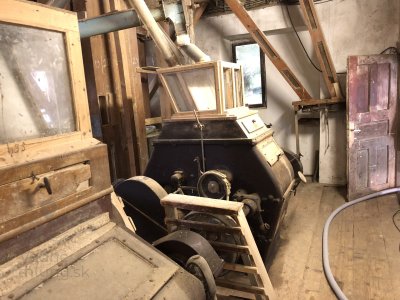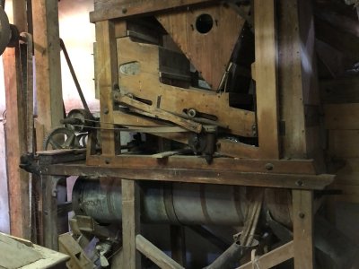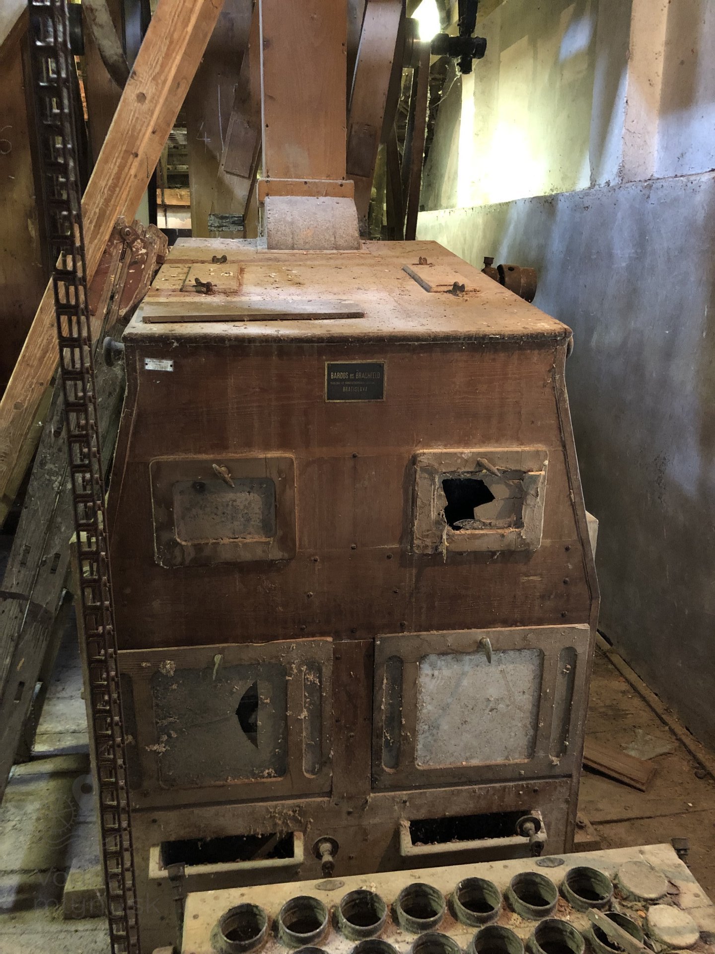 Transmisia v podkroví mlyna, 2023, © Wagner, (Prvky na obrázku: transmisie, remenice, prevody, transmisie, remenice, prevody - ozubené kolesá, pastorky (priemyselne vyrobené), transmisie, remenice, prevody - transmisný hriadeľ s remenicami (vyrobenými priemyselne či remeselne), výťahy a dopravníky)