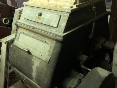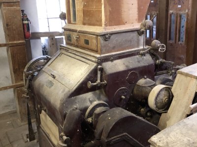 Dvojitá valcová stolica od firmy Mahaň Pardubice s jedným párom hladkých valcov, 2023, © Wagner, (Prvky na obrázku: Valcová stolica, zásobník, násypka)