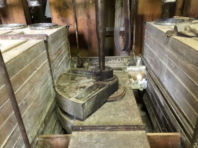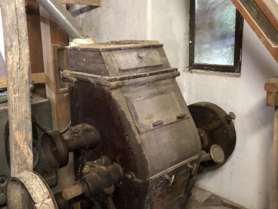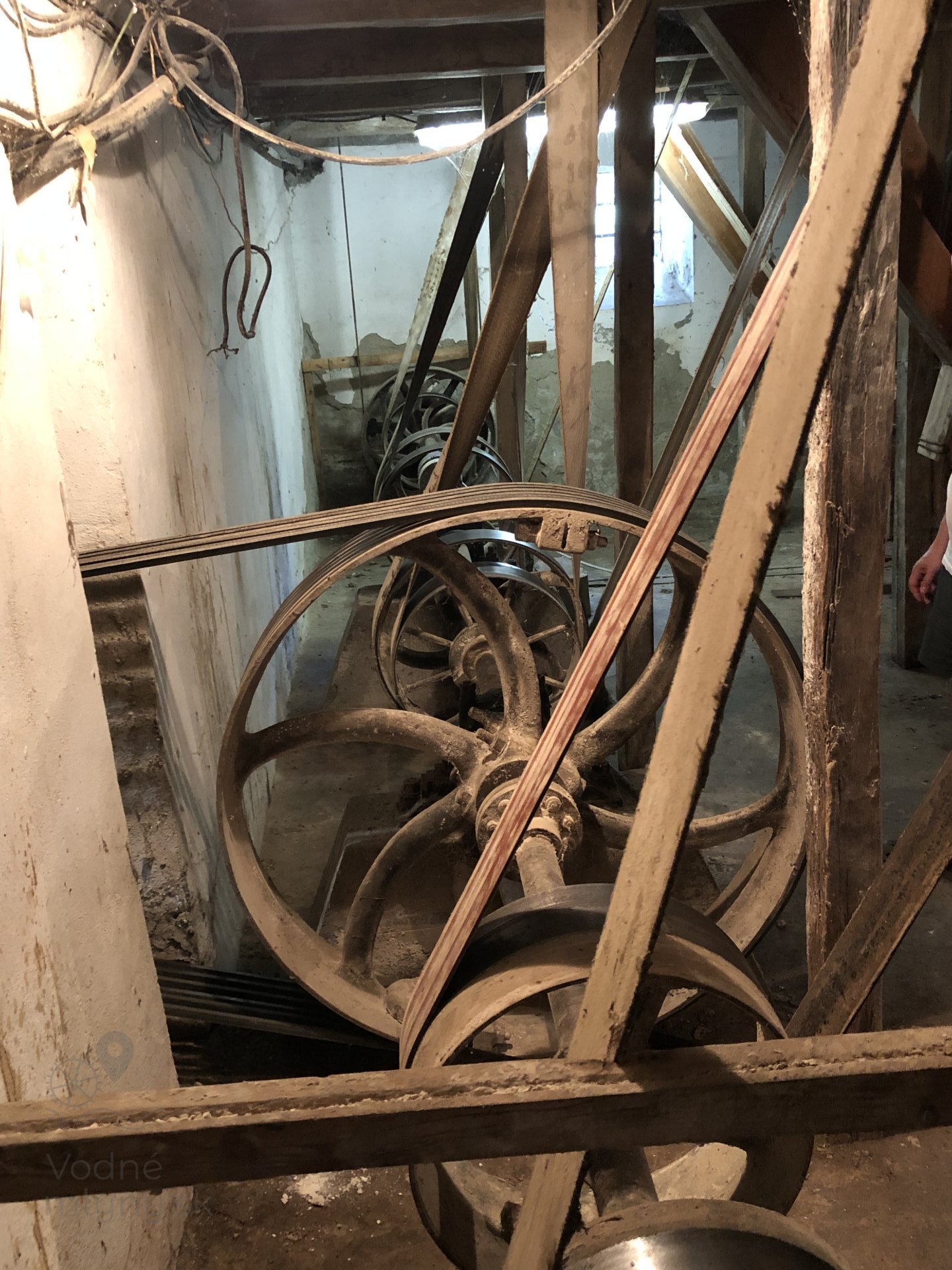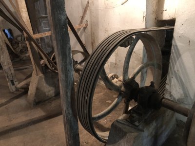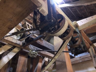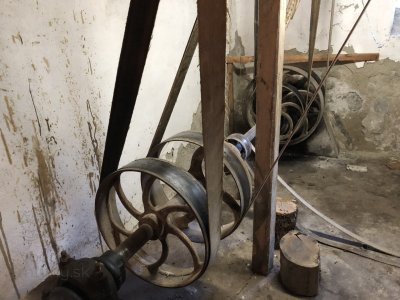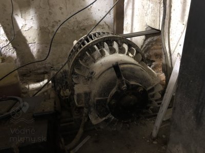 Hlavná transmisia mlyna, 2023, © Wagner, (Prvky na obrázku: transmisie, remenice, prevody, transmisie, remenice, prevody - ozubené kolesá, pastorky (priemyselne vyrobené), transmisie, remenice, prevody - transmisný hriadeľ s remenicami (vyrobenými priemyselne či remeselne))