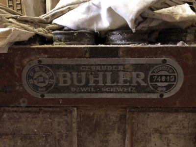 Výrobný štítok na hadicovom filtri fy. Gebrüder Bühler, 2023, © Wagner, (Prvky na obrázku: odlučovacie zariadenie, značka výrobcu na technologickom vybavení)
