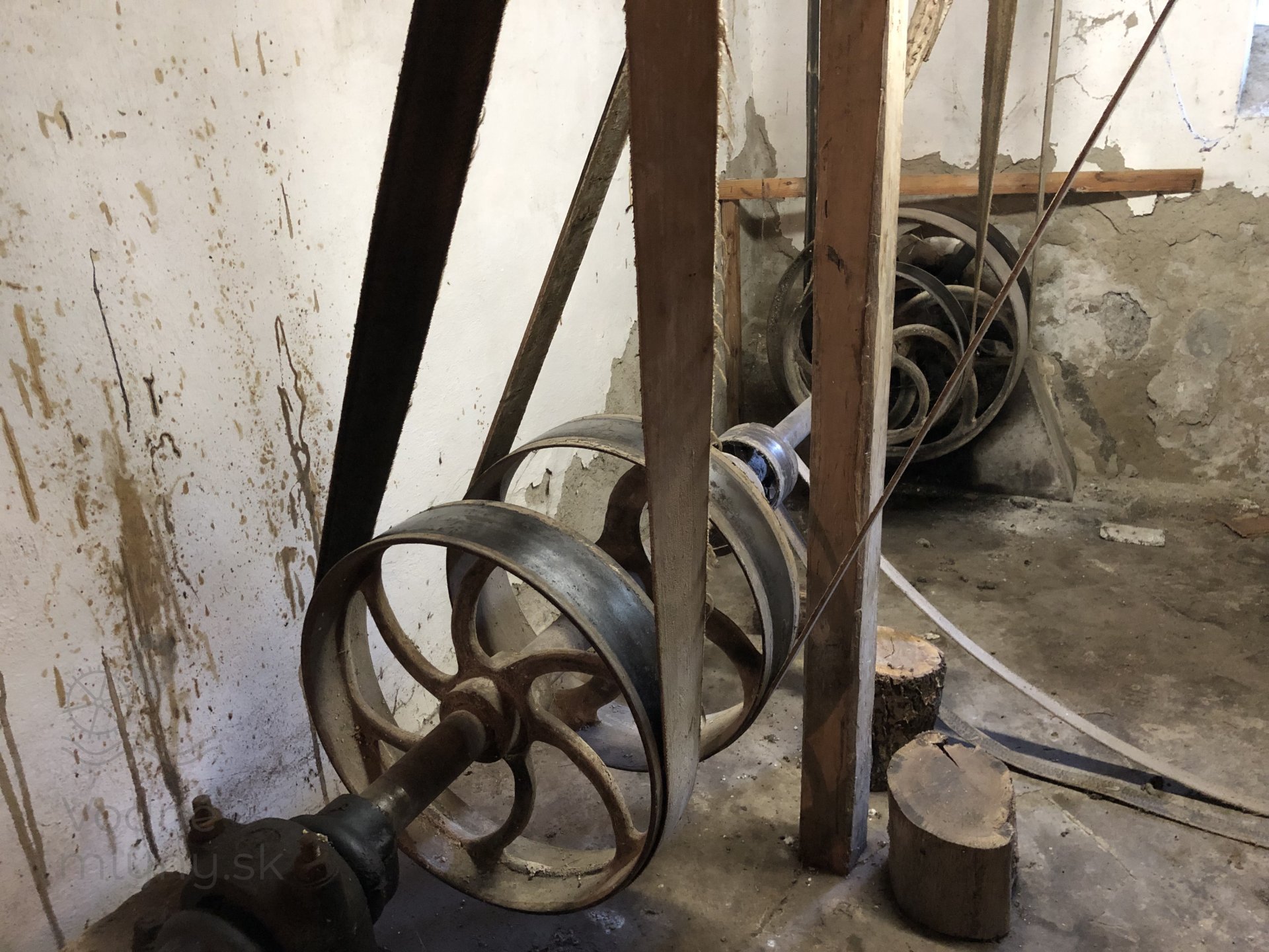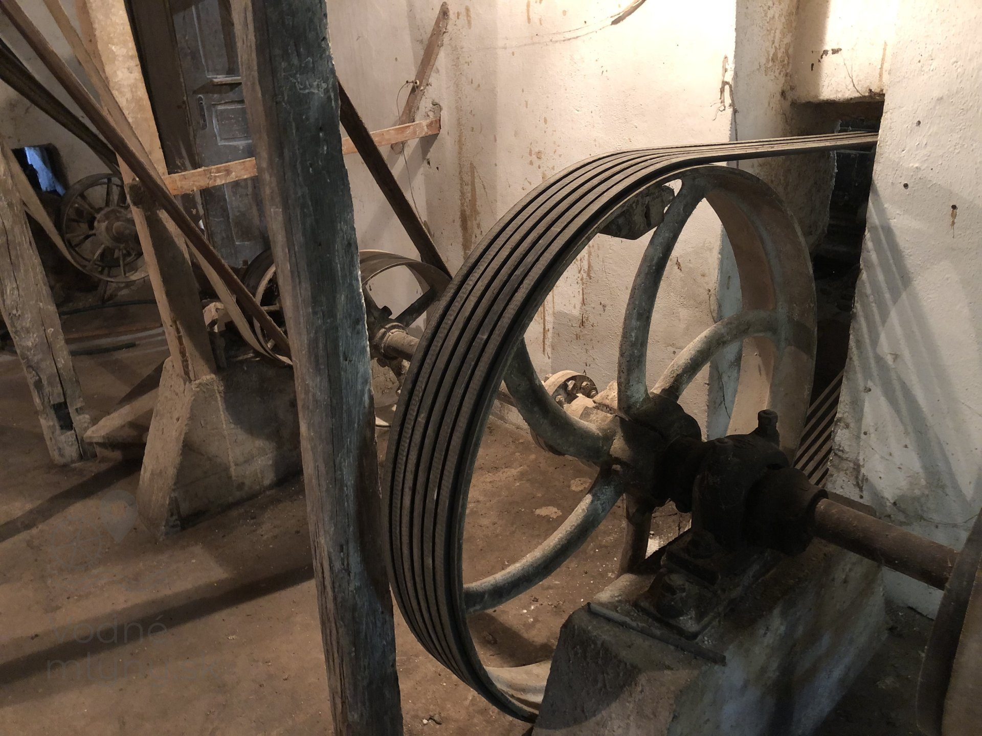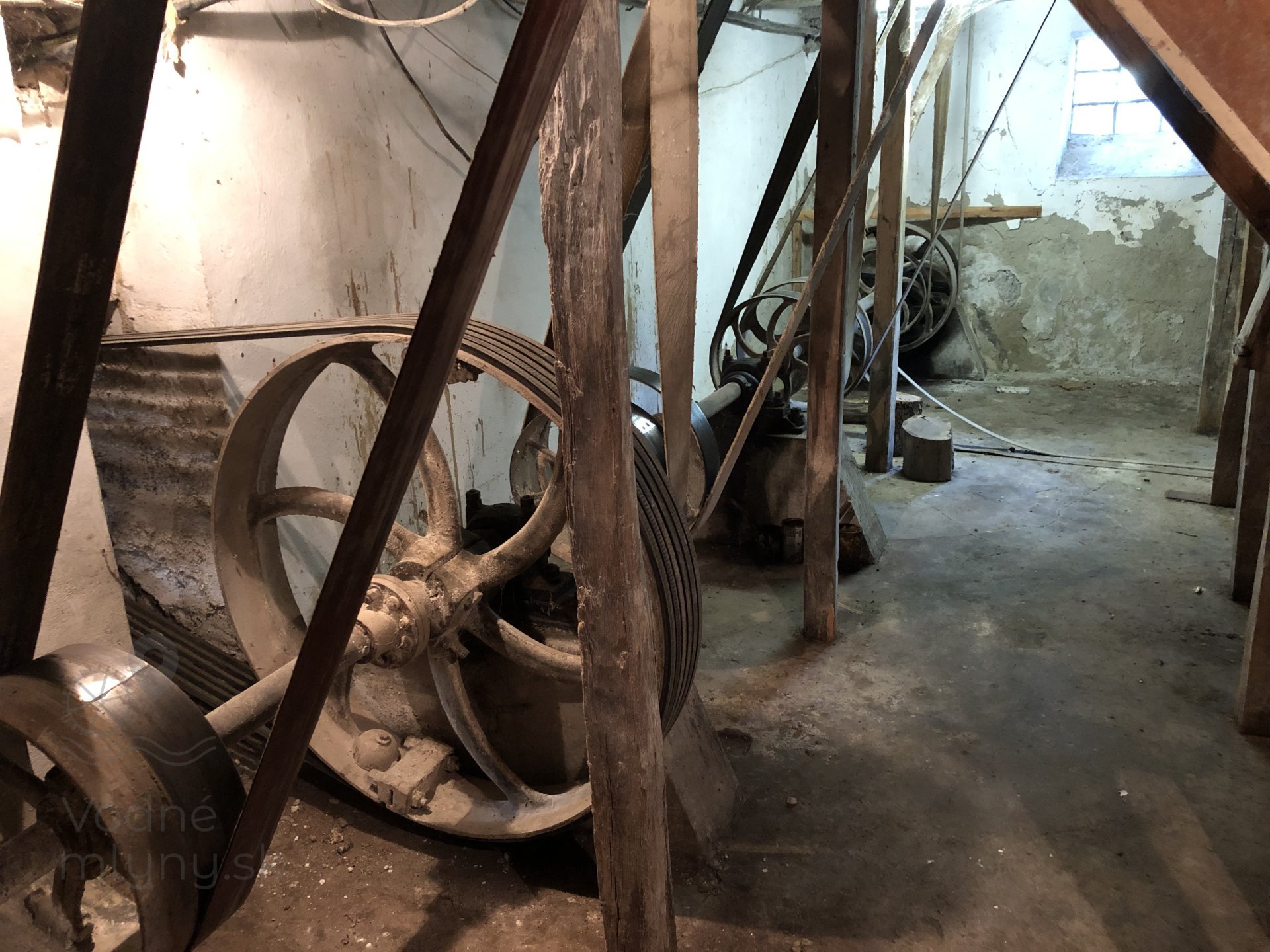 Hlavná transmisia mlyna s remeňmi, 2023, © Wagner, (Prvky na obrázku: transmisie, remenice, prevody, transmisie, remenice, prevody - ozubené kolesá, pastorky (priemyselne vyrobené), transmisie, remenice, prevody - transmisný hriadeľ s remenicami (vyrobenými priemyselne či remeselne))
