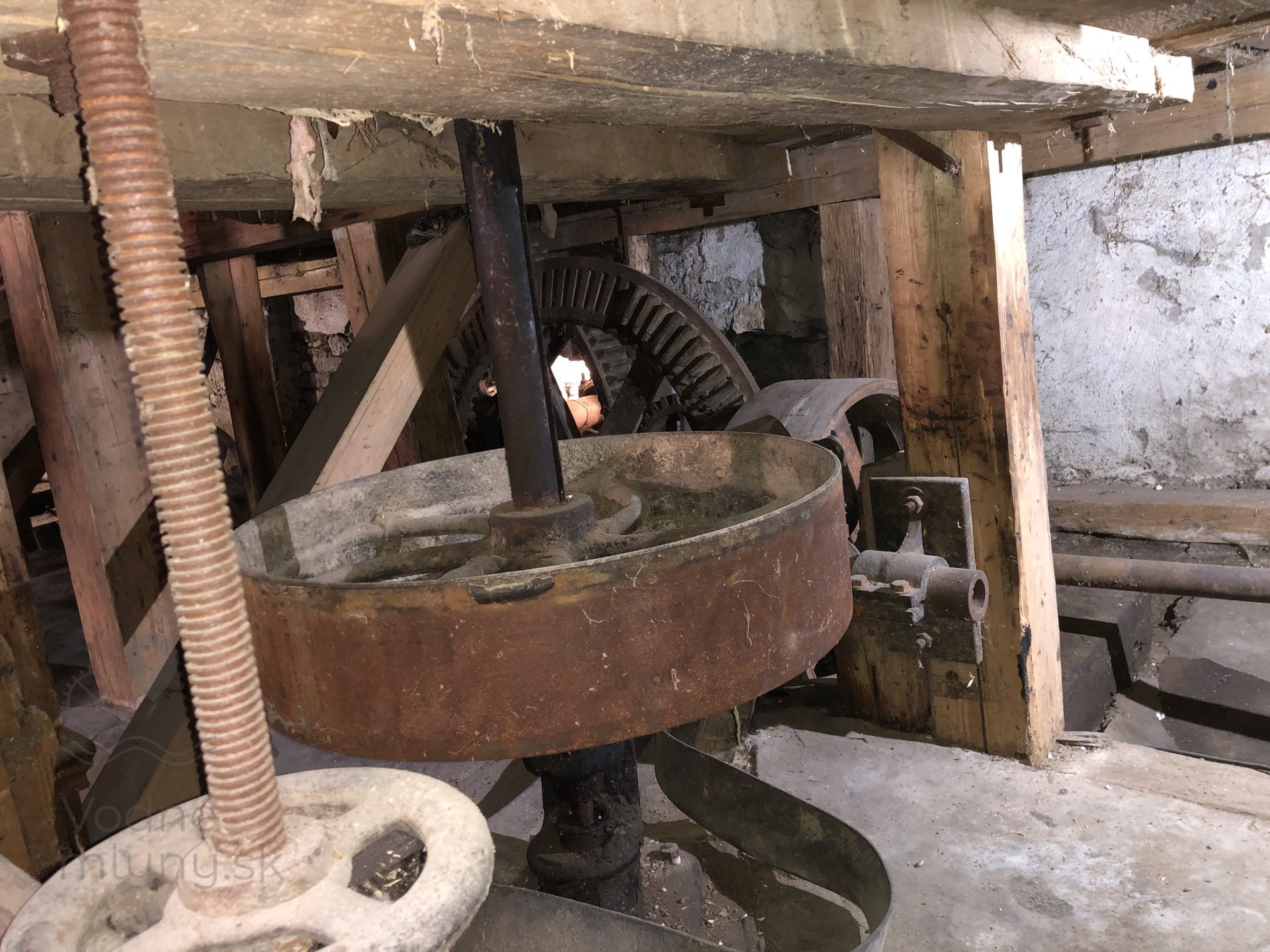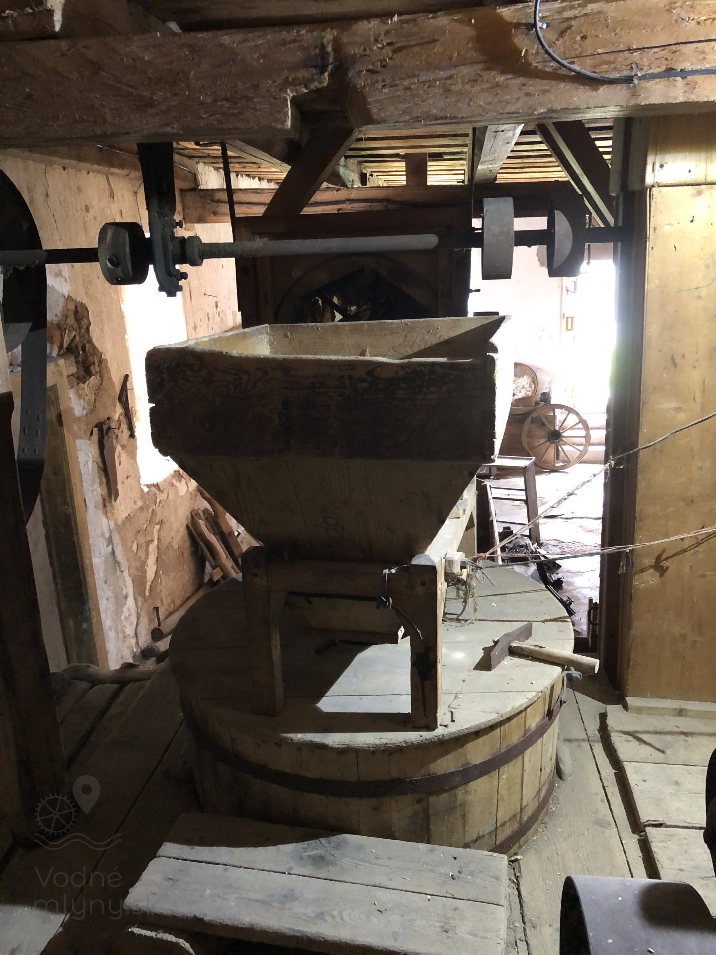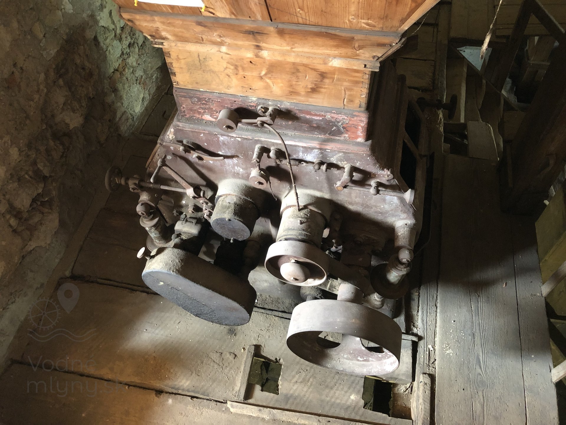 Kamenné zloženie s pohonom od transmisie, 2023, © Wagner, (Prvky na obrázku: transmisie, remenice, prevody - ozubené kolesá, pastorky (priemyselne vyrobené), transmisie, remenice, prevody - transmisný hriadeľ s remenicami (vyrobenými priemyselne či remeselne), mlynská hranica, kamenné zloženie (šrotovacie, mlecie), násypný kôš - kopčah)