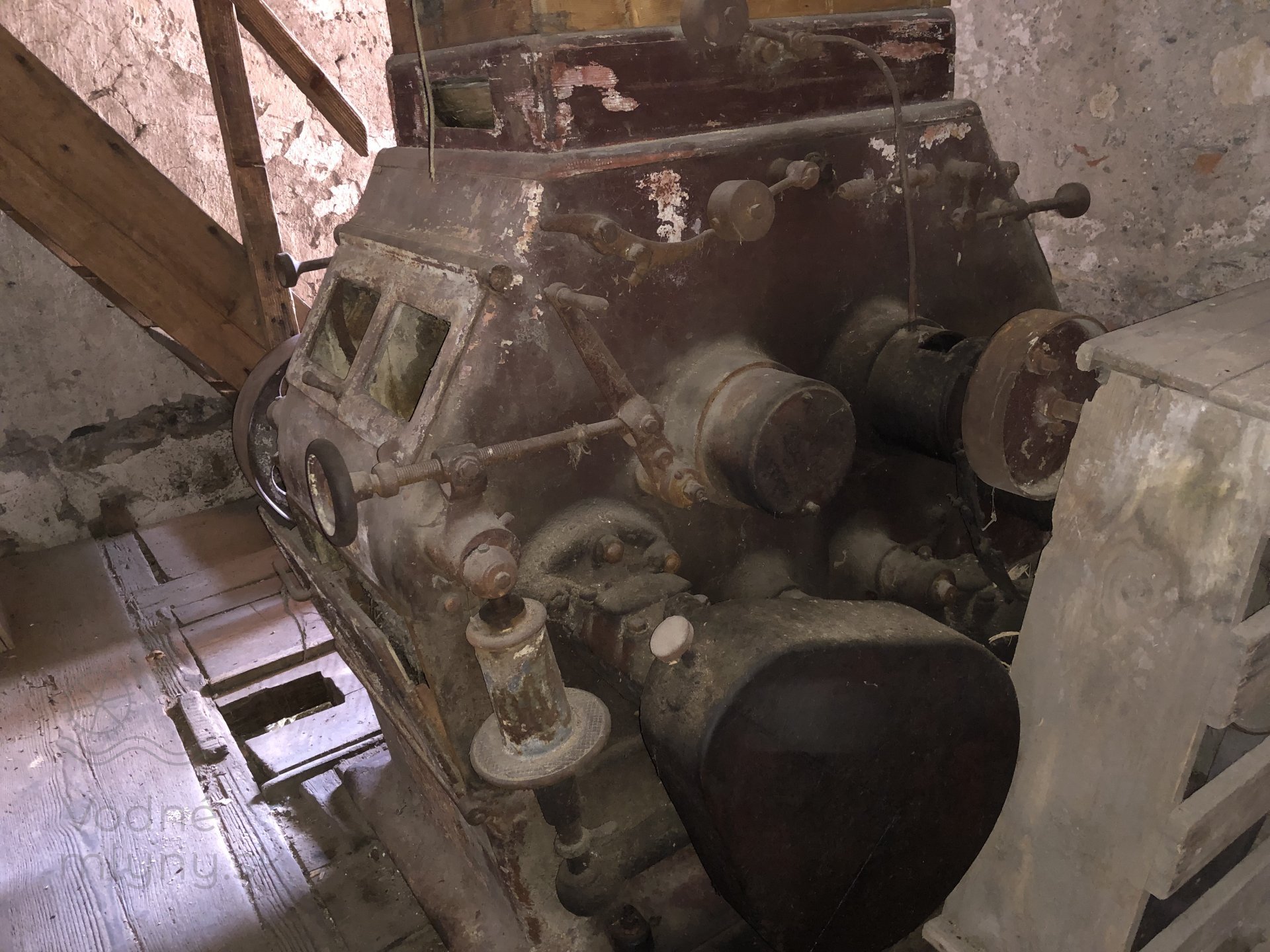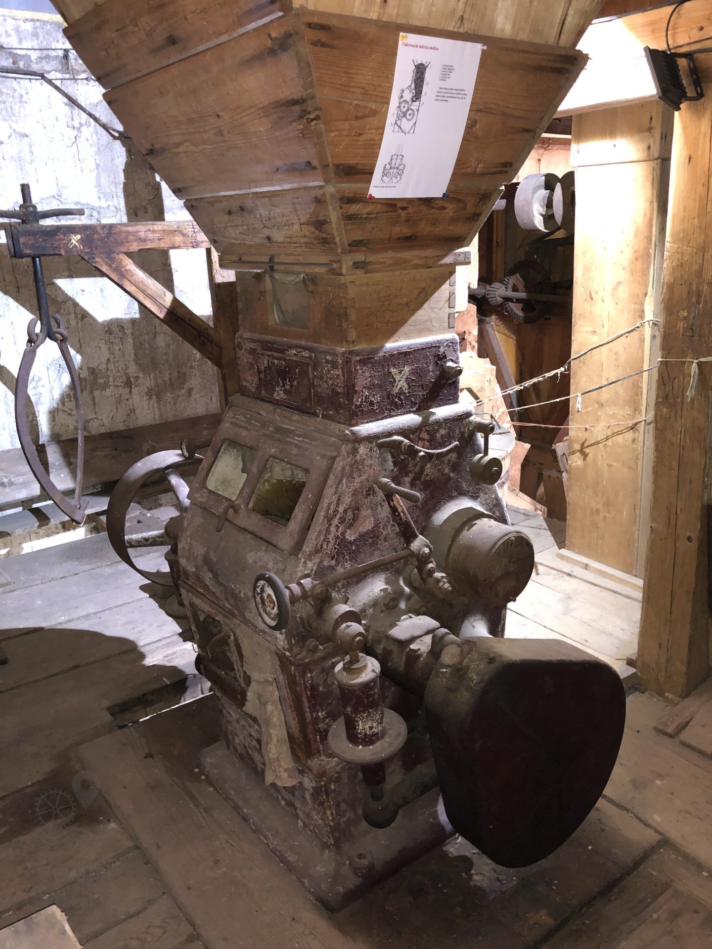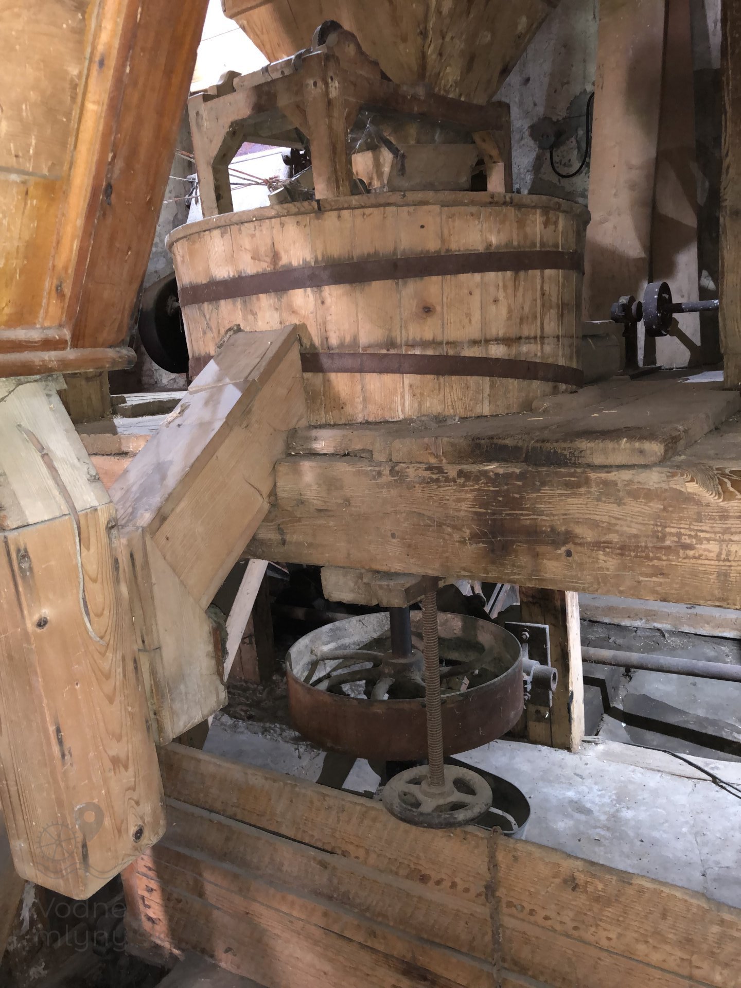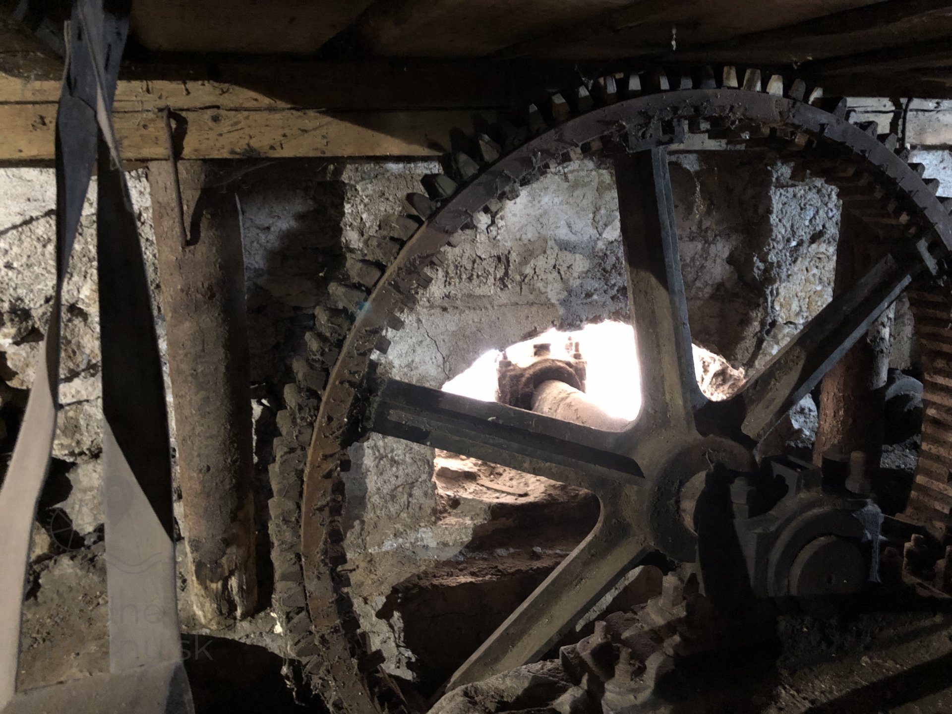 Kamenné zloženie s pohonom od transmisie, 2023, © Wagner, (Prvky na obrázku: transmisie, remenice, prevody - ozubené kolesá, pastorky (priemyselne vyrobené), transmisie, remenice, prevody - transmisný hriadeľ s remenicami (vyrobenými priemyselne či remeselne), mlynská hranica, kamenné zloženie (šrotovacie, mlecie), násypný kôš - kopčah)