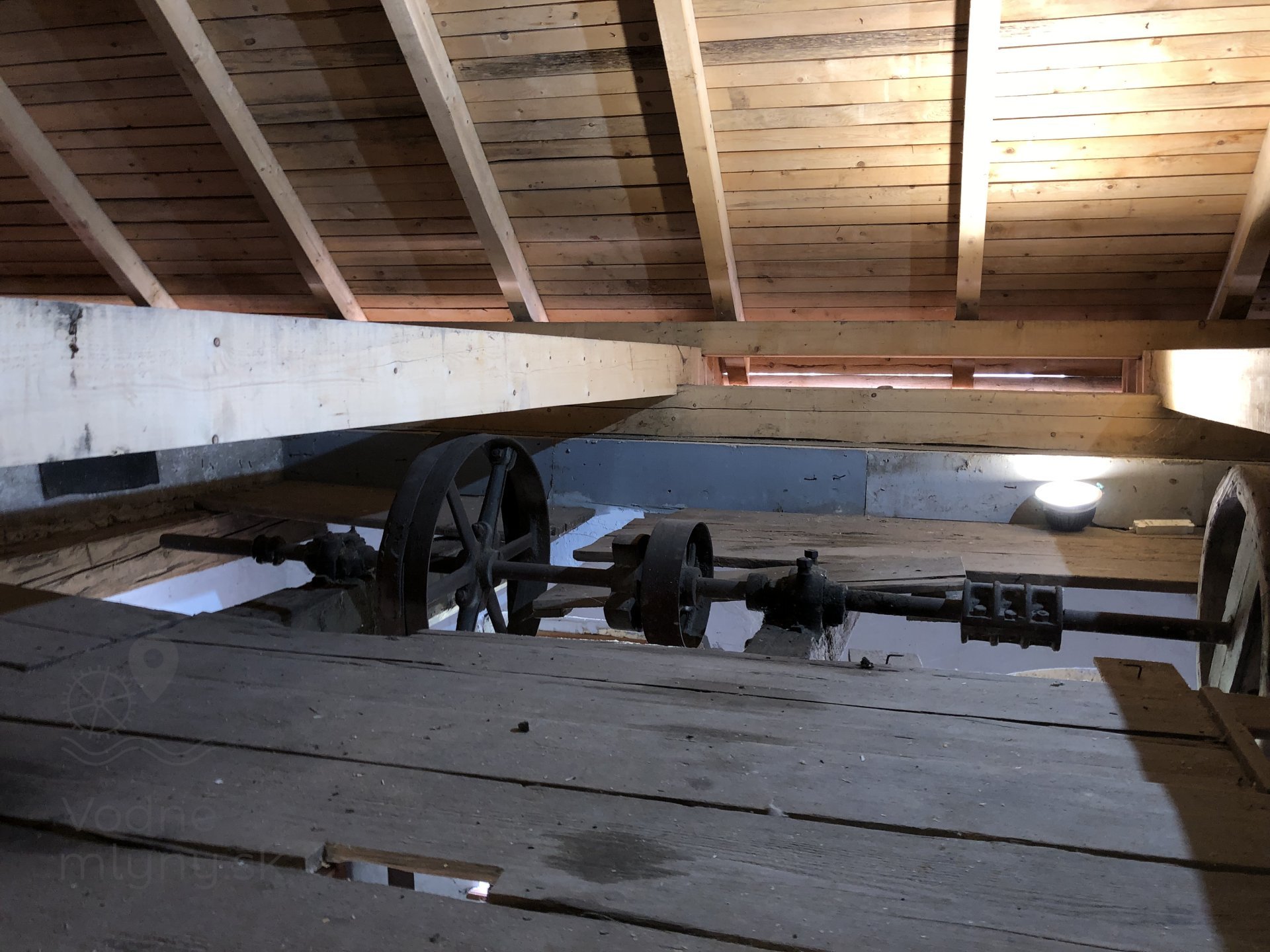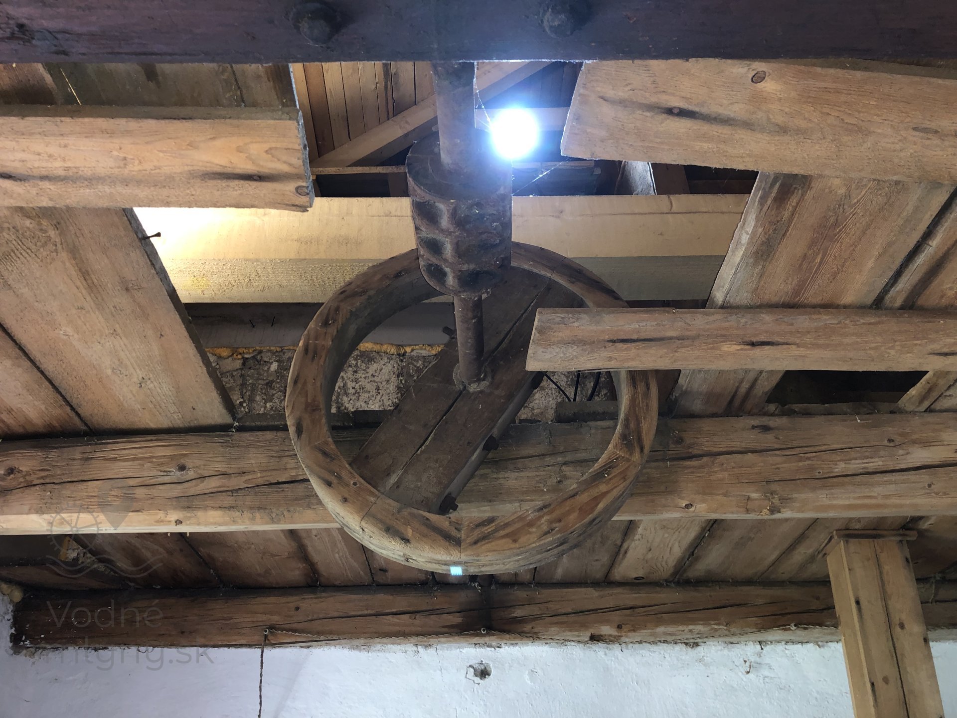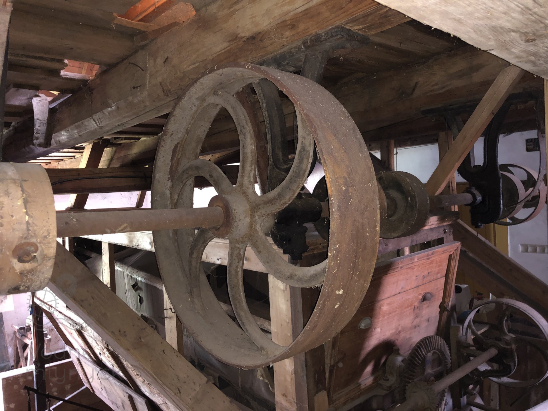 Drevená remenica v podkroví mlyna, 2023, © Wagner, (Prvky na obrázku: transmisie, remenice, prevody, transmisie, remenice, prevody - transmisný hriadeľ s remenicami (vyrobenými priemyselne či remeselne))