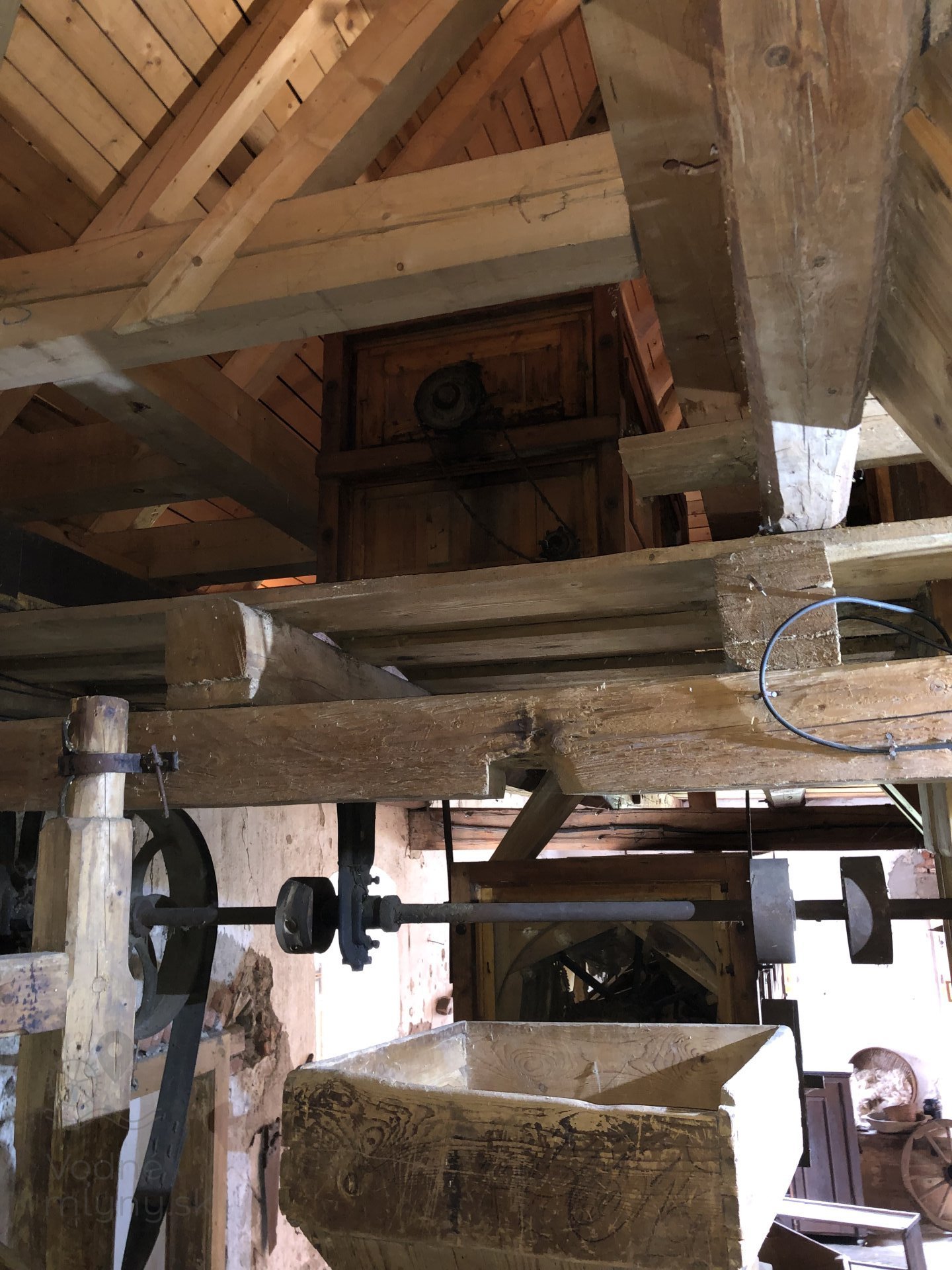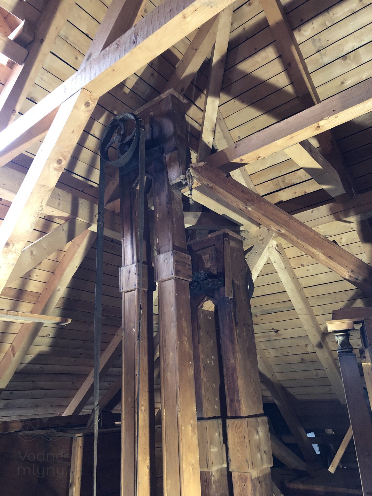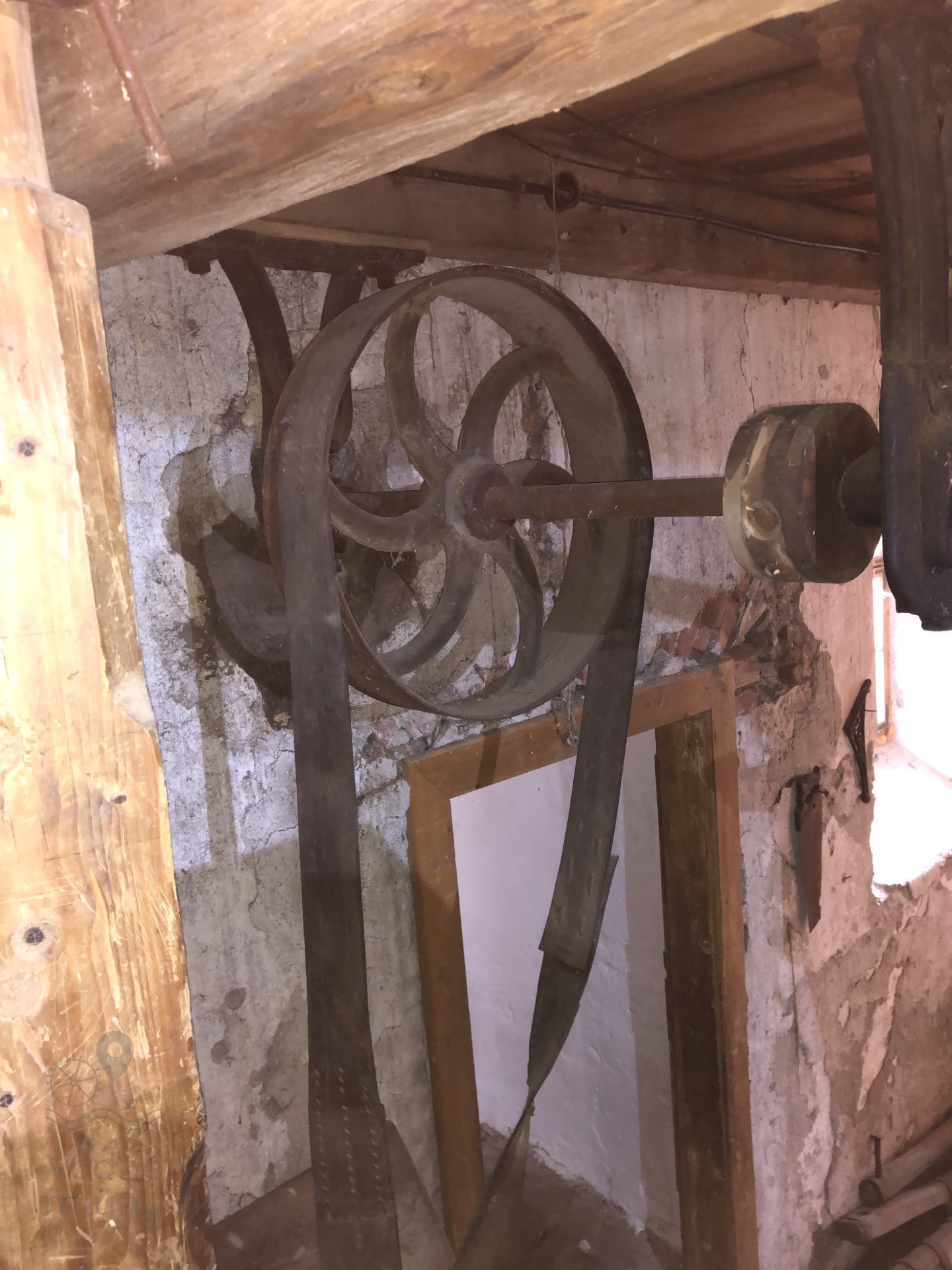 Drevená remenica v podkroví mlyna, 2023, © Wagner, (Prvky na obrázku: transmisie, remenice, prevody, transmisie, remenice, prevody - transmisný hriadeľ s remenicami (vyrobenými priemyselne či remeselne))