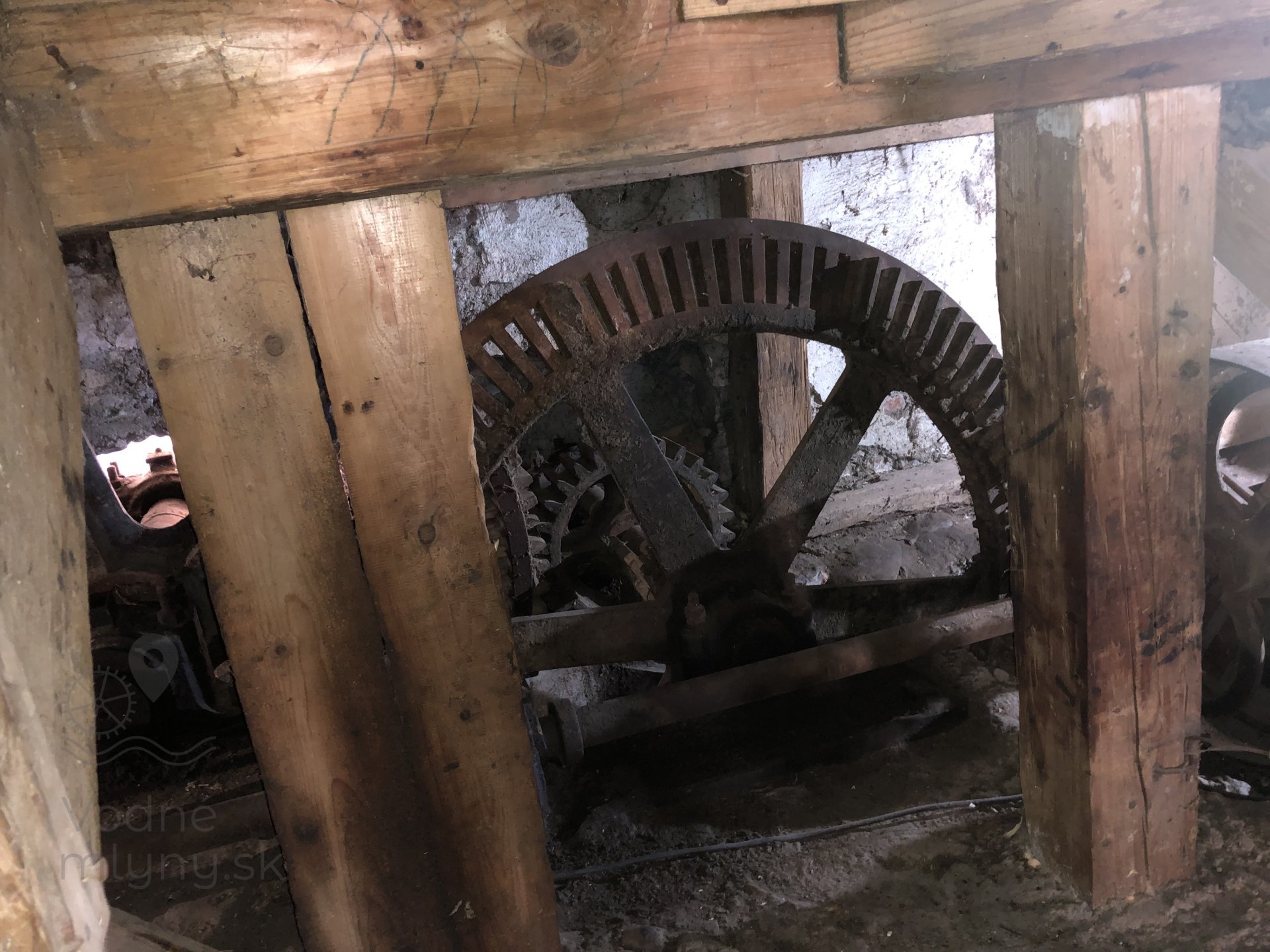 Prevod od transmisie na pohon kamenného zloženia, 2023, © Wagner, (Prvky na obrázku: transmisie, remenice, prevody, transmisie, remenice, prevody - palečné koleso, pastorky, cievy (remeselne vyrobené), transmisie, remenice, prevody - ozubené kolesá, pastorky (priemyselne vyrobené), transmisie, remenice, prevody - transmisný hriadeľ s remenicami (vyrobenými priemyselne či remeselne))