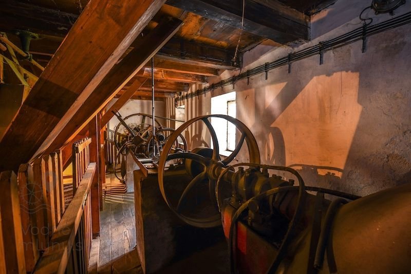 Pohľad na hlavnú transmisiu a turbínu v interiéri mlyna, 2022, © reality.sk, (Prvky na obrázku: Turbína, transmisie, remenice, prevody, transmisie, remenice, prevody - transmisný hriadeľ s remenicami (vyrobenými priemyselne či remeselne))