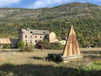 Pohľad na mlyn a umelecké dielo pri ňom, október 2022, © Lukáš Patera